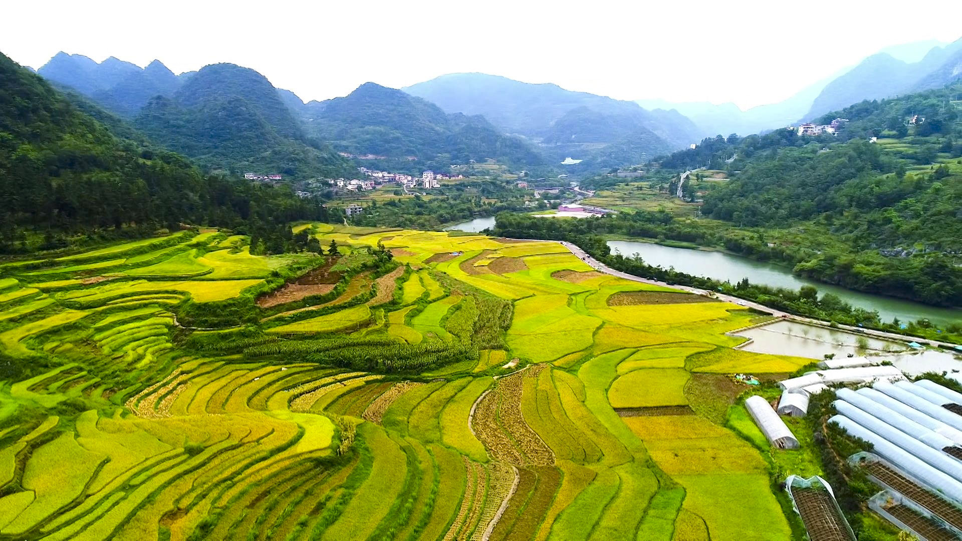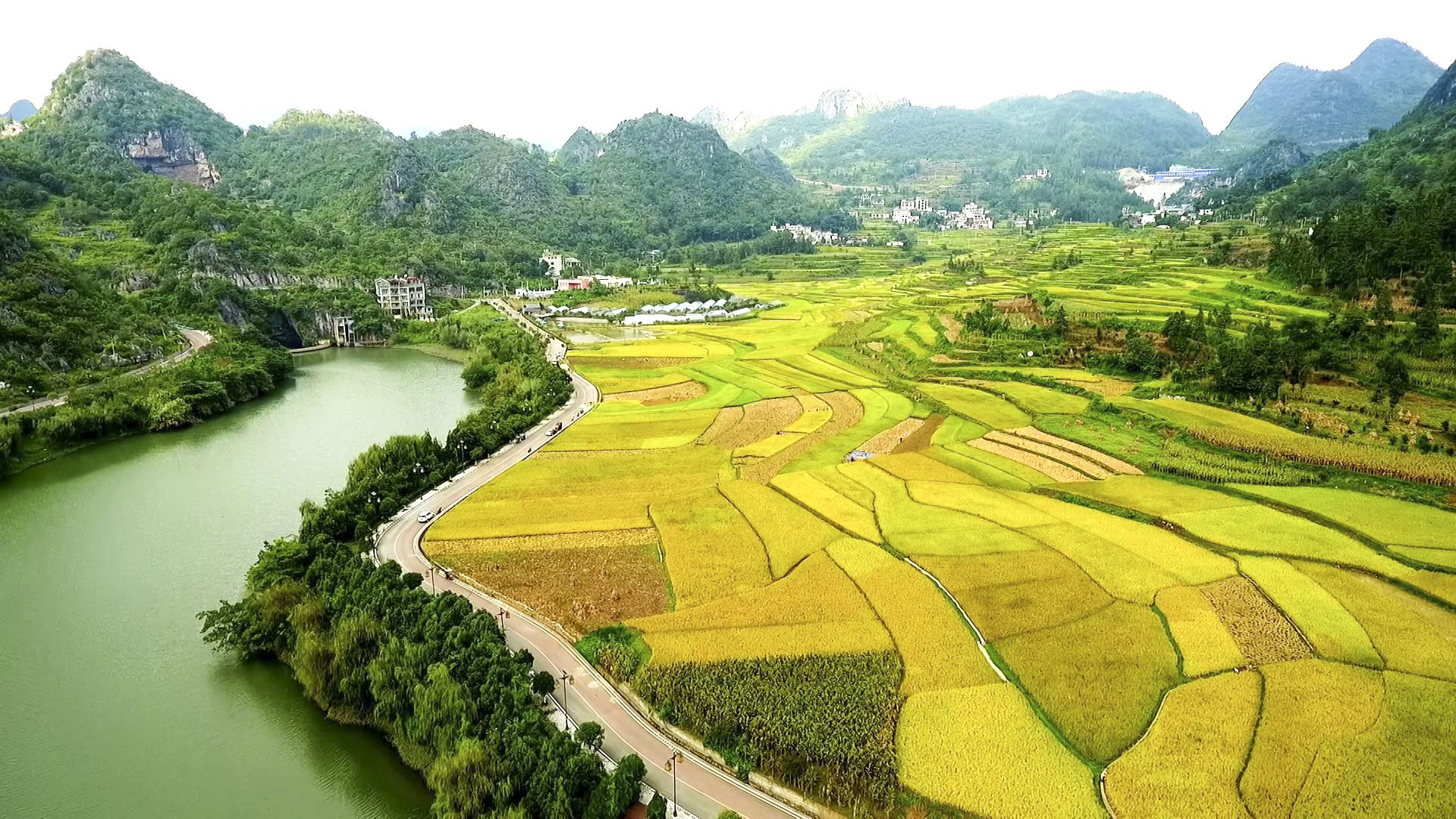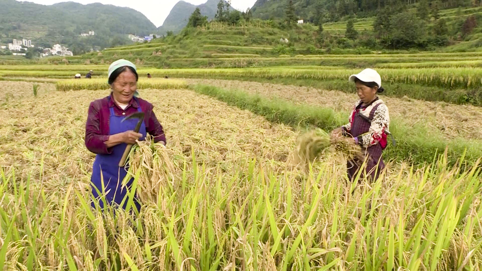 金黄是秋天的底色。时下,在六盘水盘州市娘娘山脚下的普古乡舍烹村,近千亩水稻一片金黄。稻田、村庄、河流,山峰,打谷收粮的热闹场景,宛如一幅丰收、和美的乡村画卷。