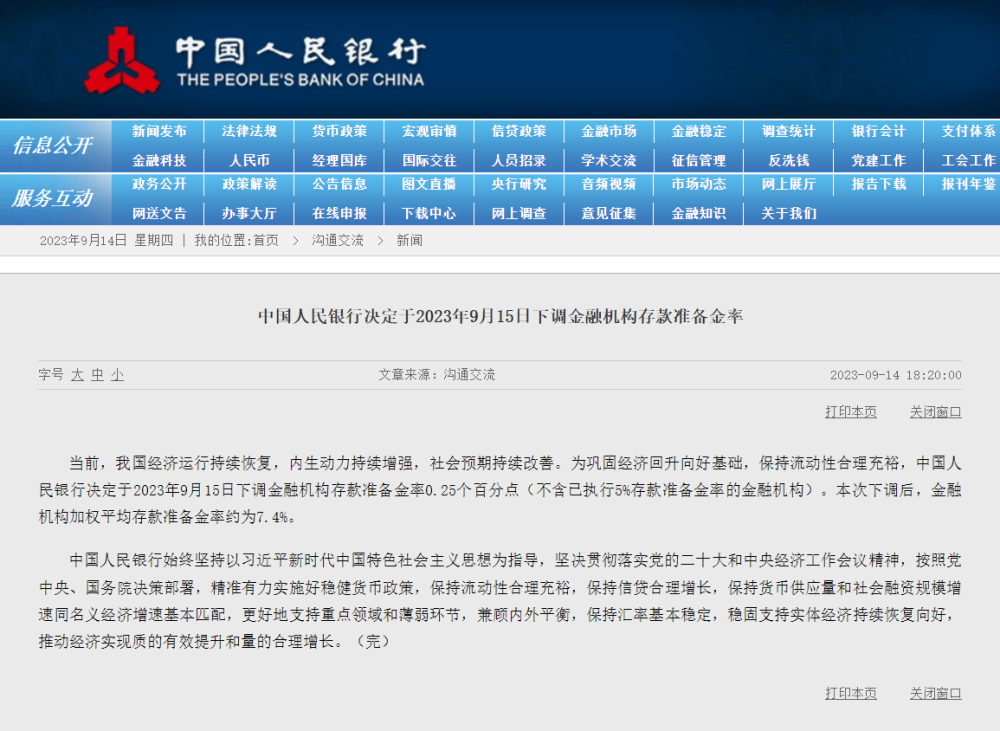 中国人民银行决定于2023年9月15日下调