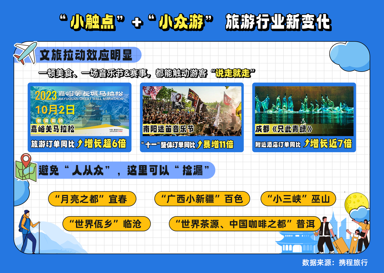 “十一”期间,演唱会、音乐节、马拉松等举办,成为拉动旅游增长的显著动力。10月2日,嘉峪关市将举办2023长城马拉松暨“长城联赛”首发站活动,预计5000人参赛,由此拉动嘉峪关旅游订单同比去年同期增长超6倍。其中,十一期间,嘉峪关机票订单预订量同比增长近3倍,酒店订单同比增长7倍。
