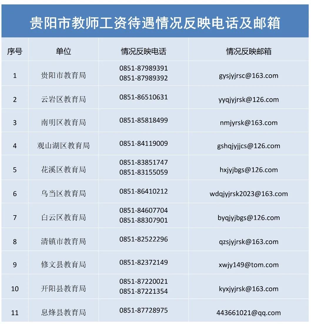 为切实保障贵阳市教师工资待遇,贵阳市教育局及各区(市、县)教育局就相关电话及邮箱进行公布,针对全市教师工资待遇发放情况,接受社会各界监督。