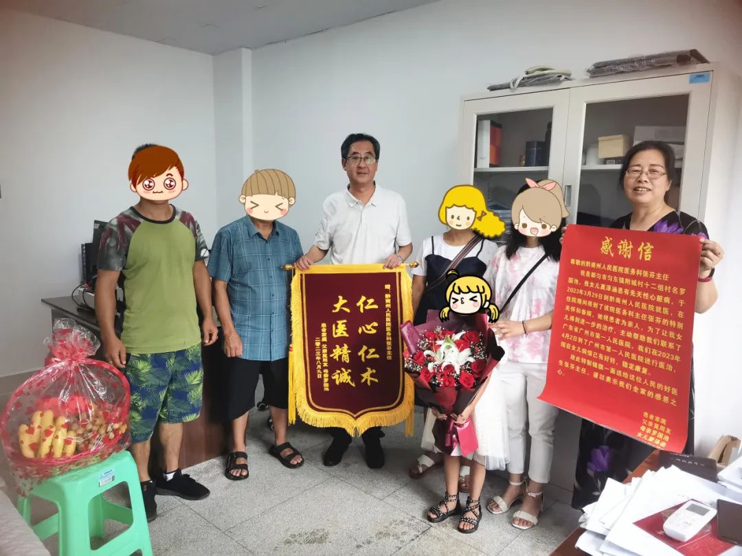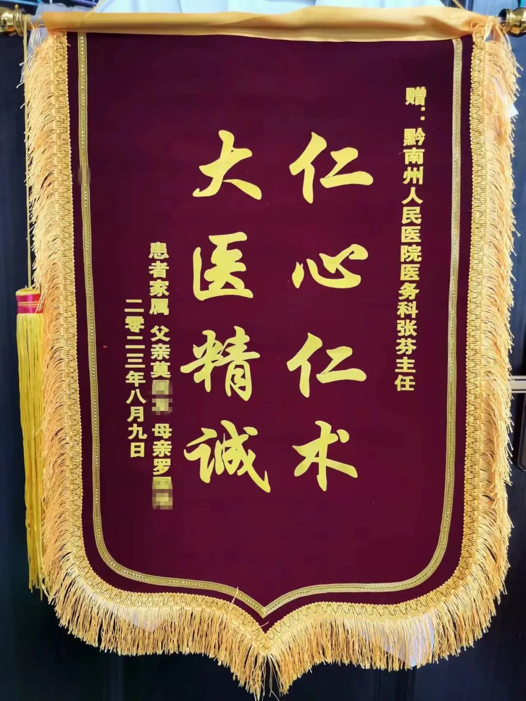 8月9日,家住都匀市匀东镇附城村十二组的莫大哥一家带着感谢信、锦旗和鲜花来到黔南州人民医院医务科将满载谢意的锦旗、感谢信送到医务科殷立科长和张芬手中。