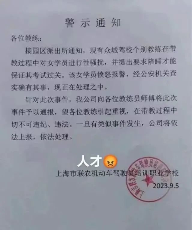 网传《警示通知》显示,接园区派出所通知,众城驾校个别教练在带教过程中对女学员进行性骚扰,并提出要求陪睡才能保证其考试过关。该女学员愤怒报警,经公安机关查实确有其事,现正在处理之中。