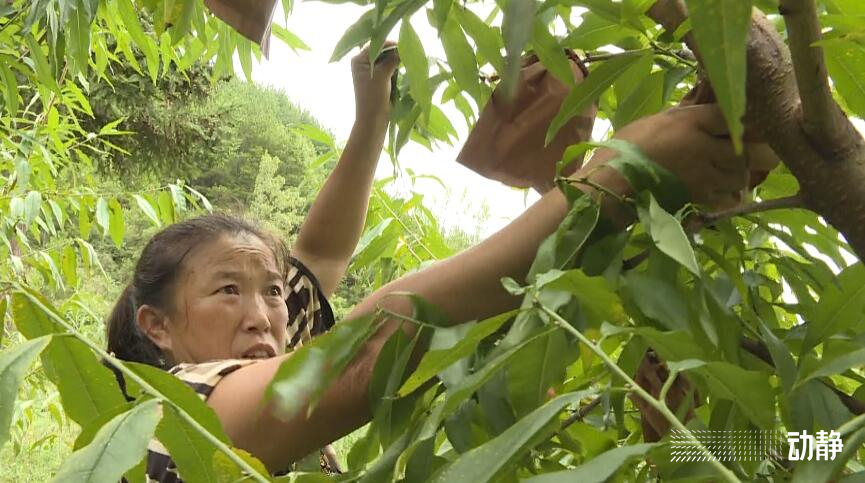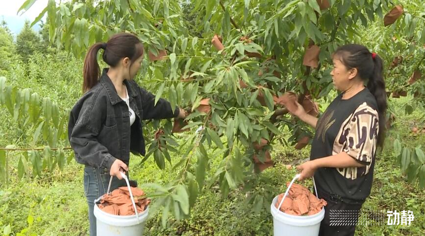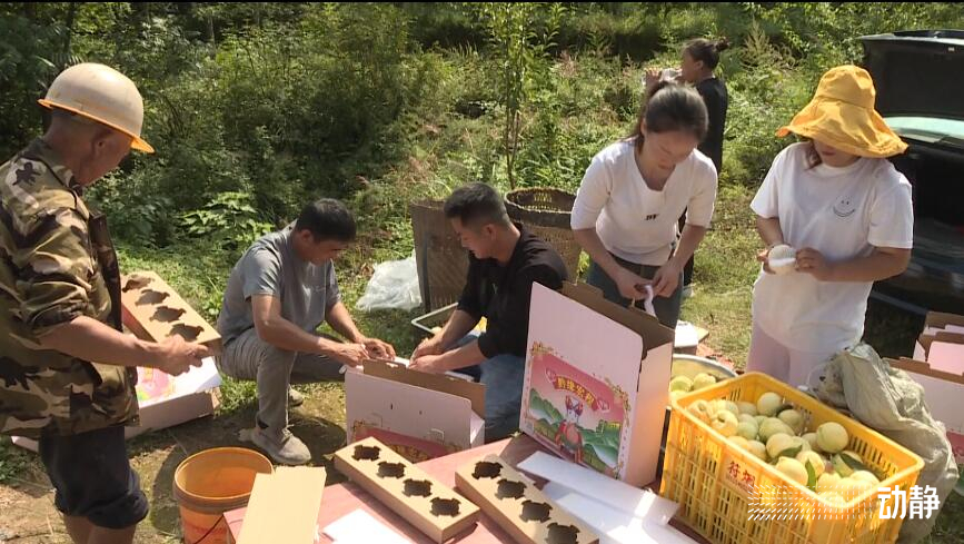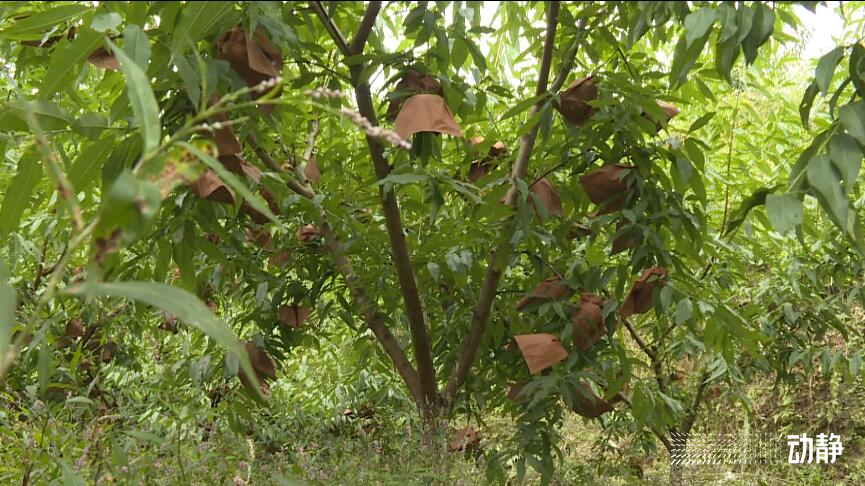 种植基地里,翠绿色的枝叶中挂满了棕色套袋,每一个袋子里都藏着一颗饱满圆润的雪桃,工人们正忙着采摘、包装,一派生机勃勃的丰收景象。