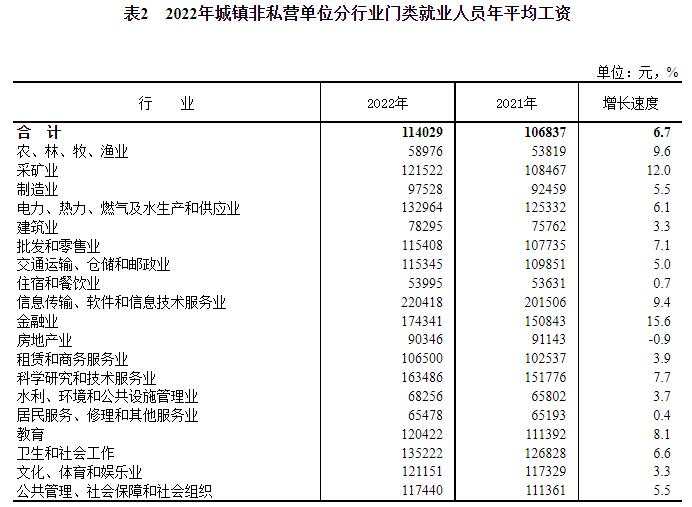 2022年城镇非私营单位分行业门类就业人员年平均工资。来自国家统计局网站