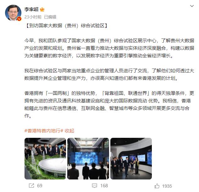 李家超在其个人微博表示,贵州省一直着力推动大数据与实体经济深度融合,构建以数据为关键要素的数字经济,以发展数字经济为重要引擎推动全省经济增长。