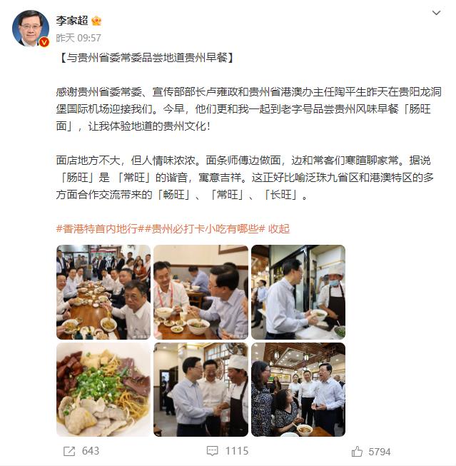 7月5日下午,香港特别行政区行政长官李家超率团到访贵州。6日上午,李家超一行前往贵阳市云岩区一家老字号品尝当地特色小吃肠旺面。随后,又和团队一起参观了国家大数据(贵州)综合试验区展示中心。当晚,李家超夜游青云市集感受贵阳夜生活。