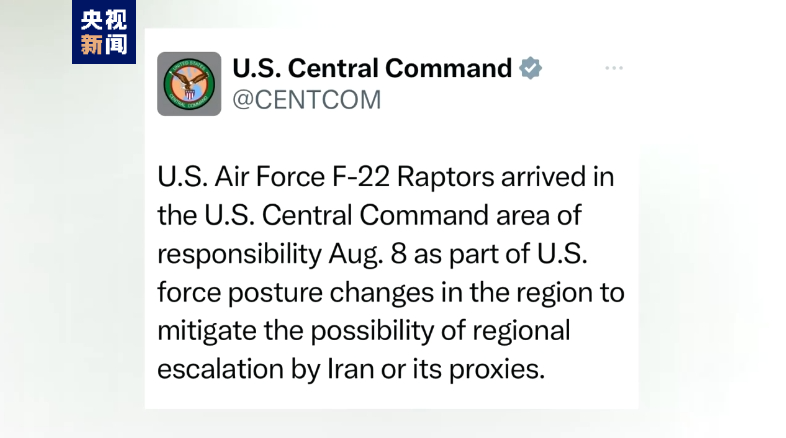 当地时间8日,美国中央司令部在社交媒体发表声明称,美军F-22战机已于当天抵达中东地区,此举旨在加强美军在中东地区的军事力量,以应对局势升级。声明没有提及这些战机的数量或确切位置。