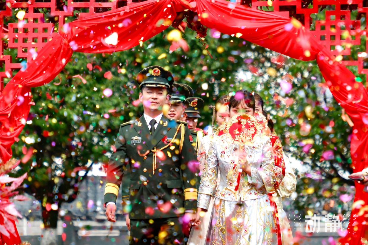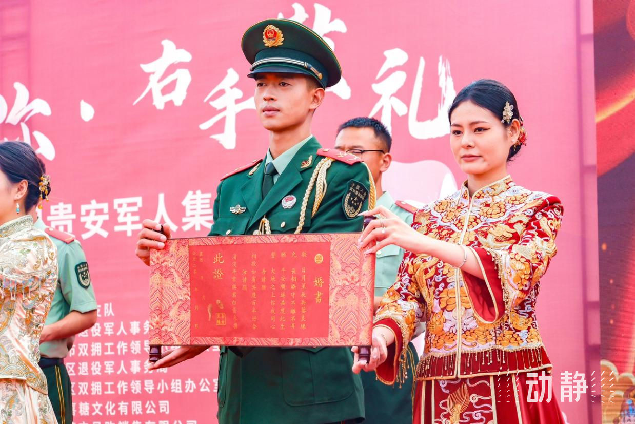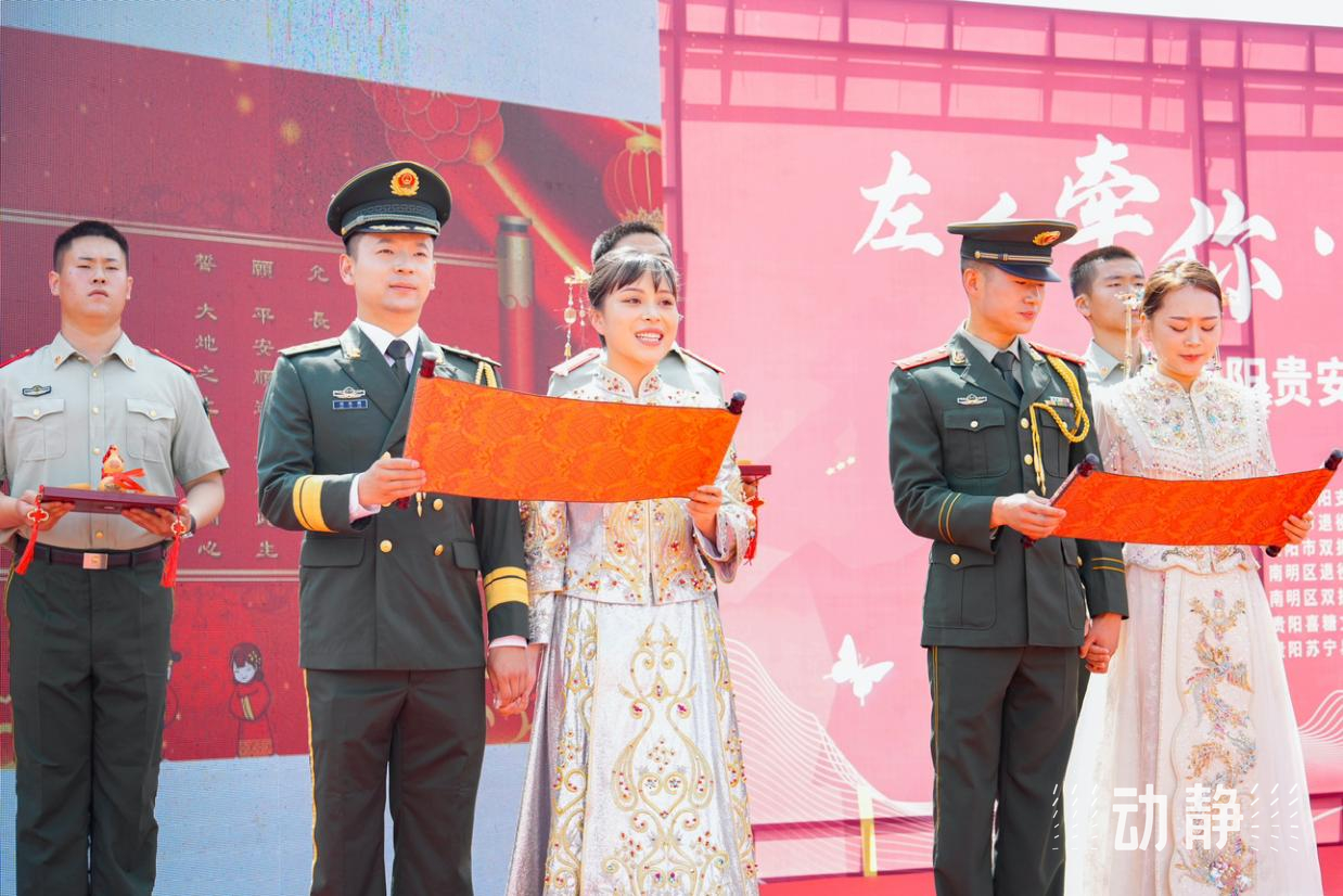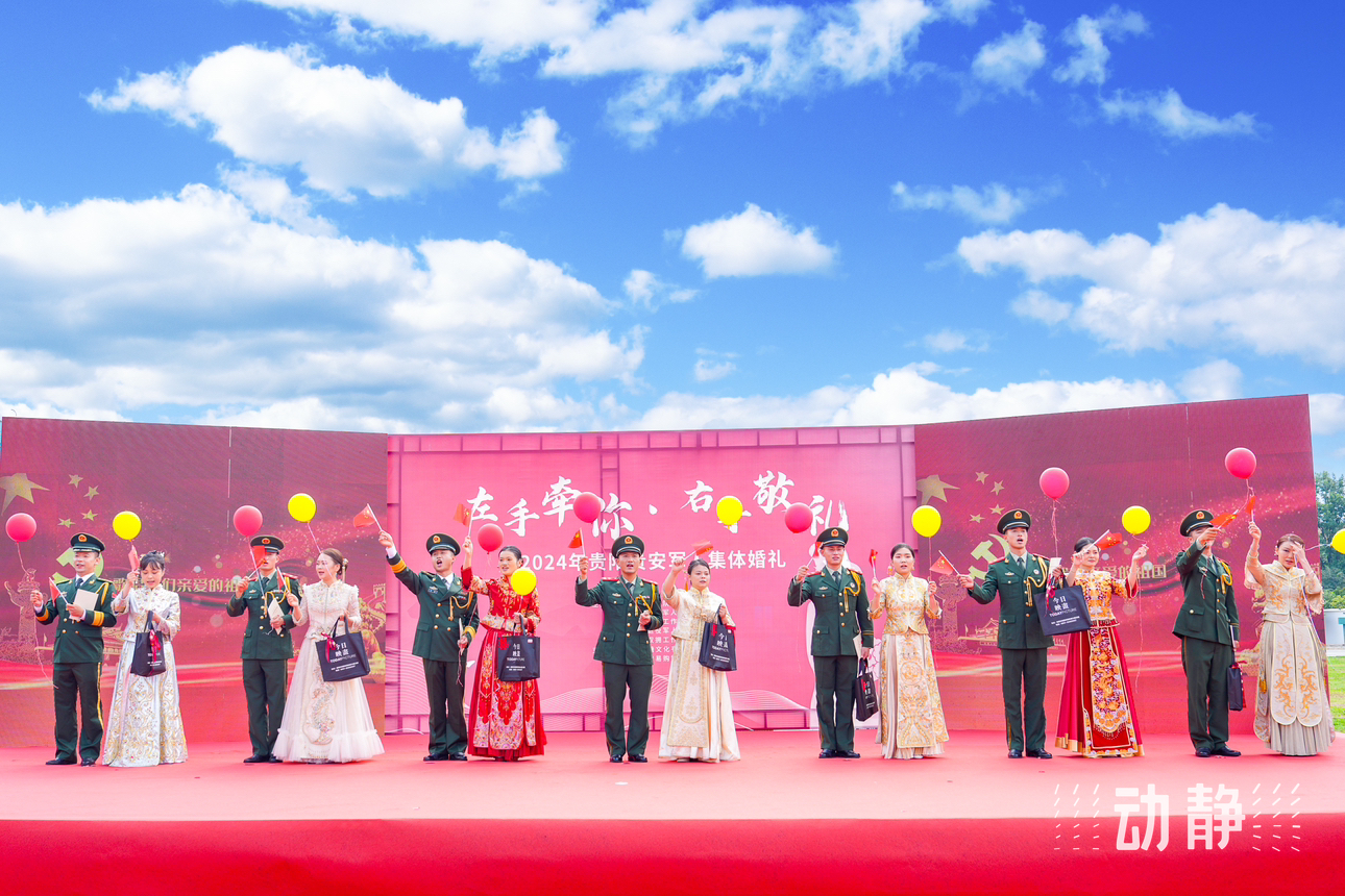 近日,武警贵州总队贵阳支队与贵阳市退役军人事务局、市双拥办、南明区退役军人事务局、区双拥办联合举办“左手牵你,右手敬礼”集体婚礼,来自五湖四海的七对新人在亲人和战友们的见证下一起跨入幸福之门。