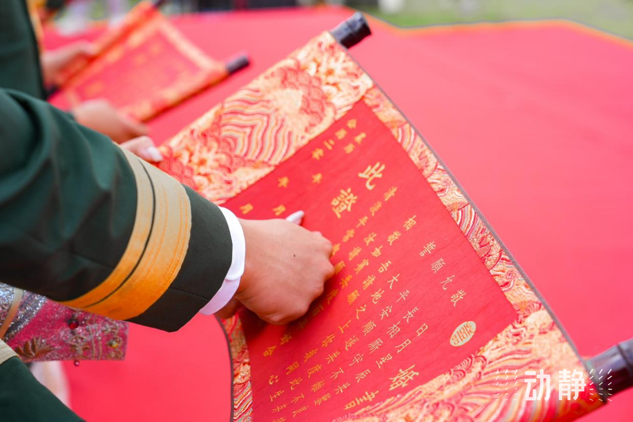 同饮交杯喜酒、签订一纸婚书、诉说真情告白……幸福与甜蜜在此刻汇聚交融。执子之手,与子偕老,笔挺的军装与优雅的婚服交相辉映,一幅浪漫的爱情画卷徐徐展开。这一刻,浪漫与忠诚同在,铁骨与柔情并存。新人们许下相爱永远、相伴终身的爱情誓言。