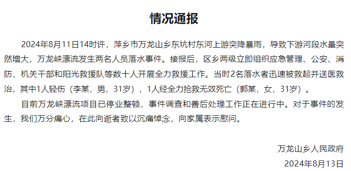 2024年8月11日14时许,萍乡市万龙山乡东坑村东河上游突降暴雨,导致下游河段水量突然增大,万龙峡漂流发生2名人员落水事件。接报后,区乡两级立即组织应急管理、公安、消防、机关干部和阳光救援队等数十人开展全力救援工作。2名落水者被救起并送医救治,其中1人轻伤(李某,男,31岁),1人经全力抢救无效死亡(郭某,女,31岁)。