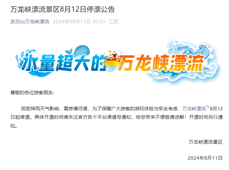 8月11日晚,武功山万龙峡漂流公众号发布停漂公告,称“因受降雨天气影响,需修缮河道,为了保障广大游客的游玩体验与安全考虑,万龙峡漂流8月12日起停漂。”