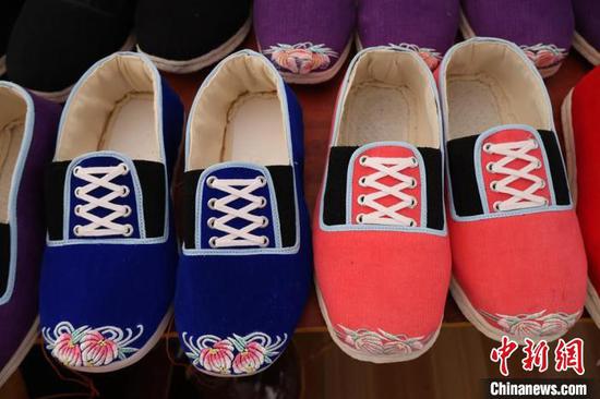 高硐村水族大妈韦金花怎么也没想到,她从母亲手上传承来的手艺,做成的手工布底鞋面绣花的绣花鞋,被购买的游客冠以“奢侈品”。