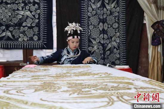 在蜡染店,记者看到李祥兰正在给被面进行“点蜡”。“被面是当地苗族村民给女儿定制的嫁妆,纯手工制作。”李祥兰说,蜡染店虽小,但是订单不断。