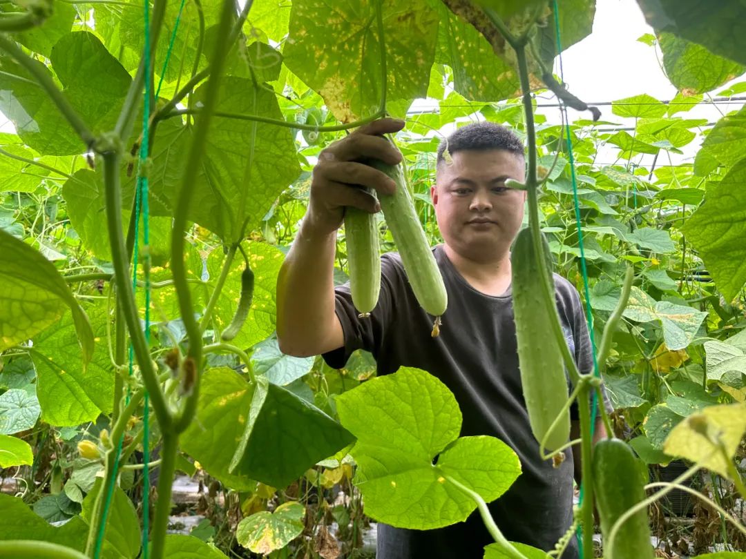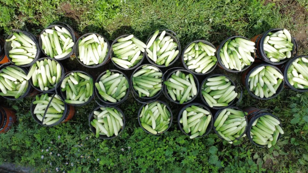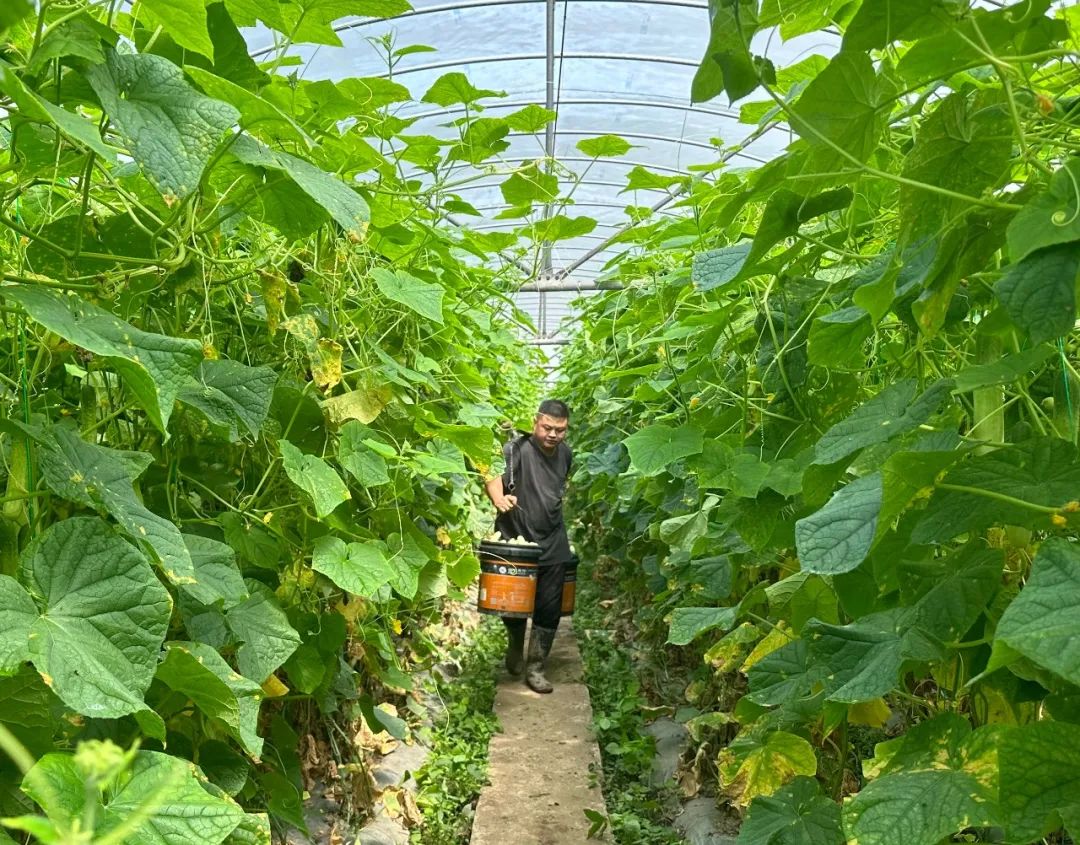在泥高镇关坝黄瓜基地,田永红和工人们正穿梭在一排排绿意盎然、生机勃勃的黄瓜藤蔓间,将一根根脆嫩的黄瓜采摘下来,不一会儿工夫就装满了一桶。
