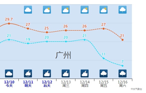 本周的寒潮过程还能影响到广东、广西、福建、海南等地,像广州,14日最低气温还有21℃,16日就降至7℃,必须要翻出厚被子了。