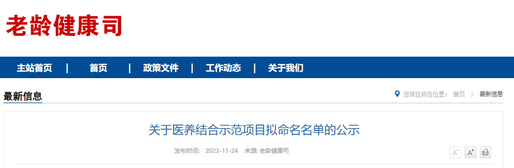根据国家卫生健康委《医养结合示范项目工作方案》(国卫老龄发〔2022〕14号)和《关于开展第一批全国医养结合示范县(市、区)和示范机构创建工作的通知》(国卫办老龄函〔2022〕128号)要求,经自评申报、省级推荐、评估验收,拟命名山东省为全国医养结合示范省、北京市海淀区等100个县(市、区)为全国医养结合示范县(市、区)、北京市乐成老年事业投资有限公司等100个机构为全国医养结合示范机构。