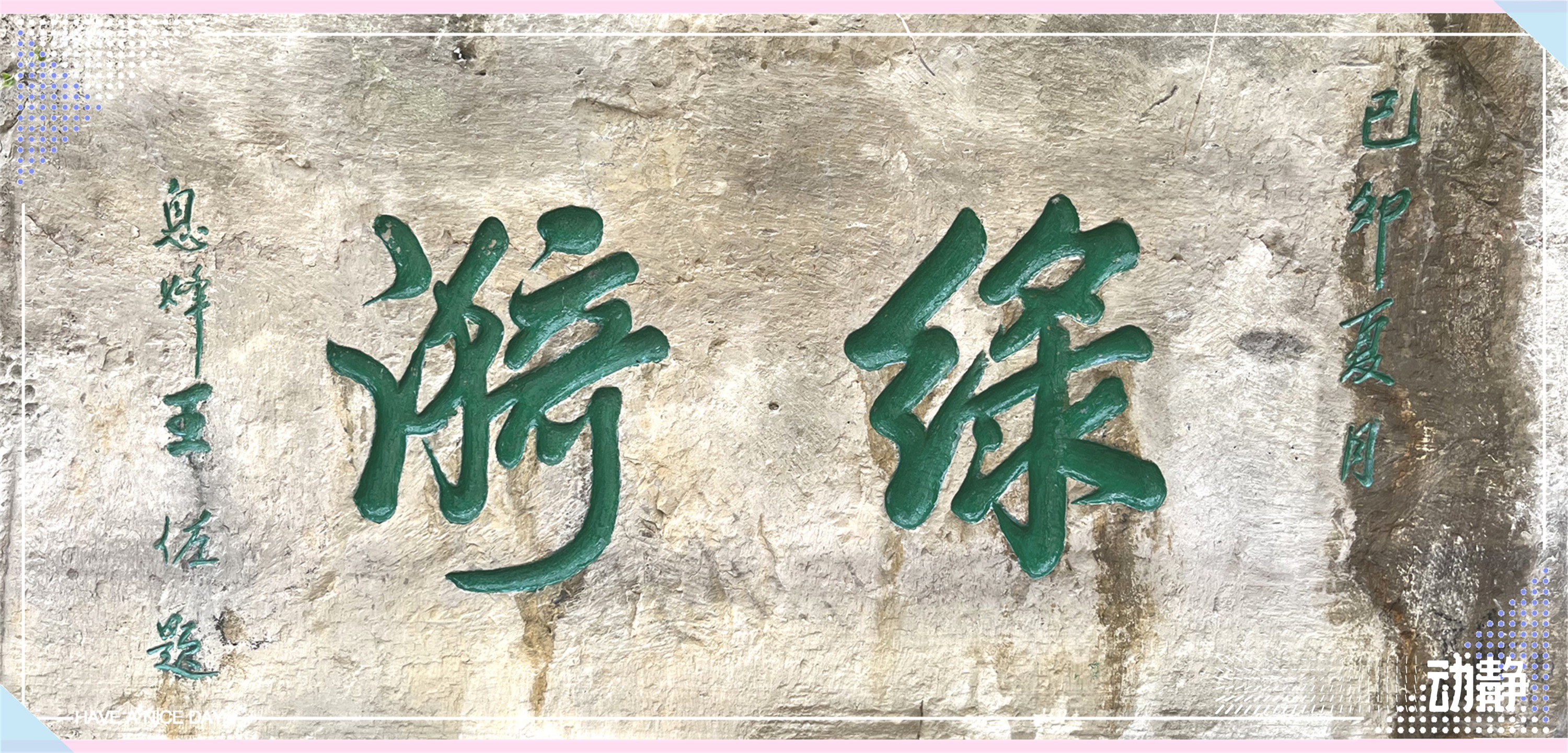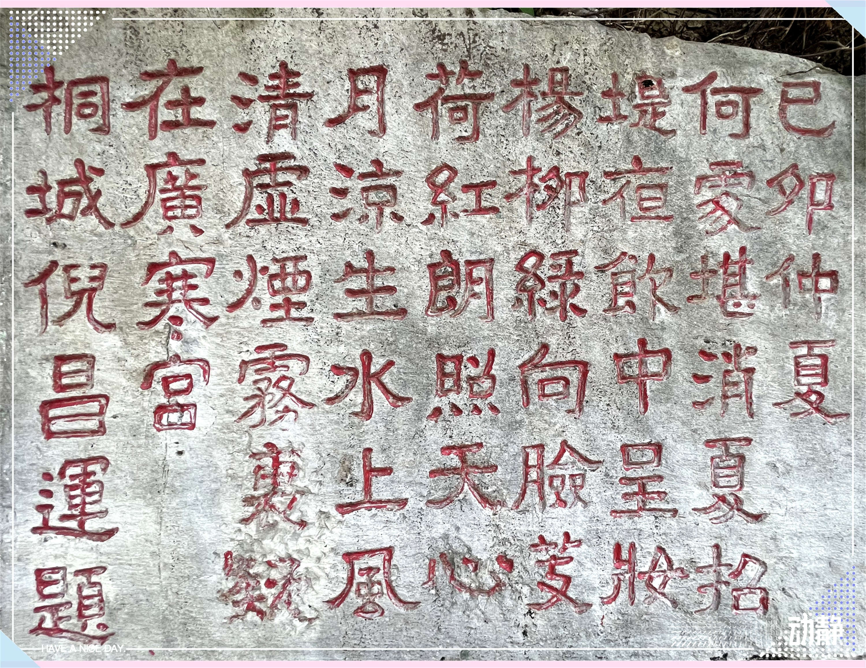 招堤尽头这个螺蛳形土堆,确实不高,但也不完全是“土”,南面基础,有几层自然堆叠的岩石,为防垮塌,建有石柱支撑,人工加固痕迹明显。上层岩壁,镌刻两方横长形摩崖,时间均为1939年夏。一块离地1.6米,宽1.5米,高0.75米。横向行书阴刻“绿漪”两字,“绿”指招堤海子,“漪”指水面的波纹。摩崖款识:“己卯夏月,息烽王佐题”。另一方略小些,宽0.9米,高0.7米。纵向楷书阴刻题诗一首:“何处堪消夏,招堤夜饮中。呈妆杨柳绿,向脸芰荷红。朗照天心月,凉生水上风。清虚烟雾里,疑在广寒宫。”款识:“己卯仲夏,桐城倪昌运题”。因为“里”的繁体字“裏”和“裹”非常像,故经常被读成“清虚烟雾裹”,似乎也能读通。