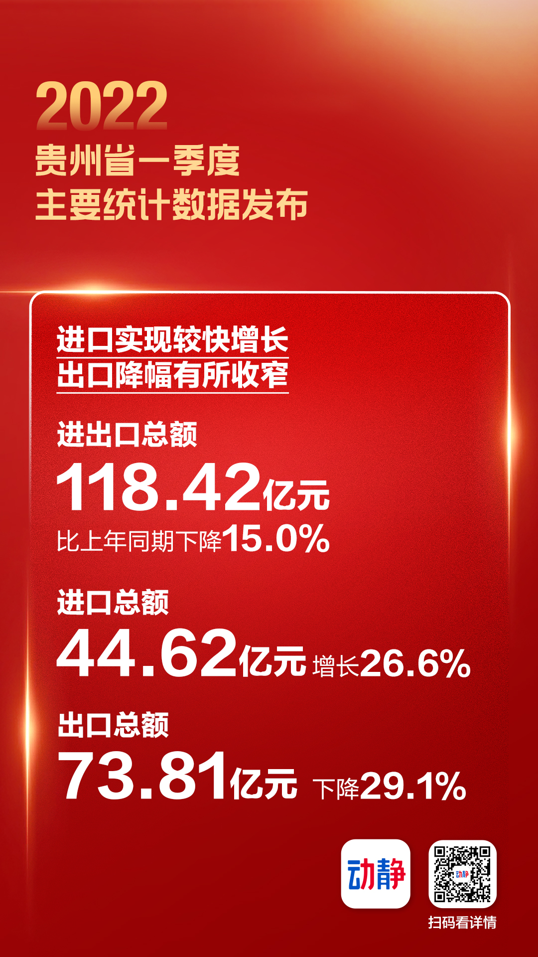 今天(4月20日)上午,记者从省政府新闻办举行的贵州省2022年一季度主要统计数据新闻发布会上了解到,今年一季度,全省进口实现较快增长,出口降幅有所收窄。