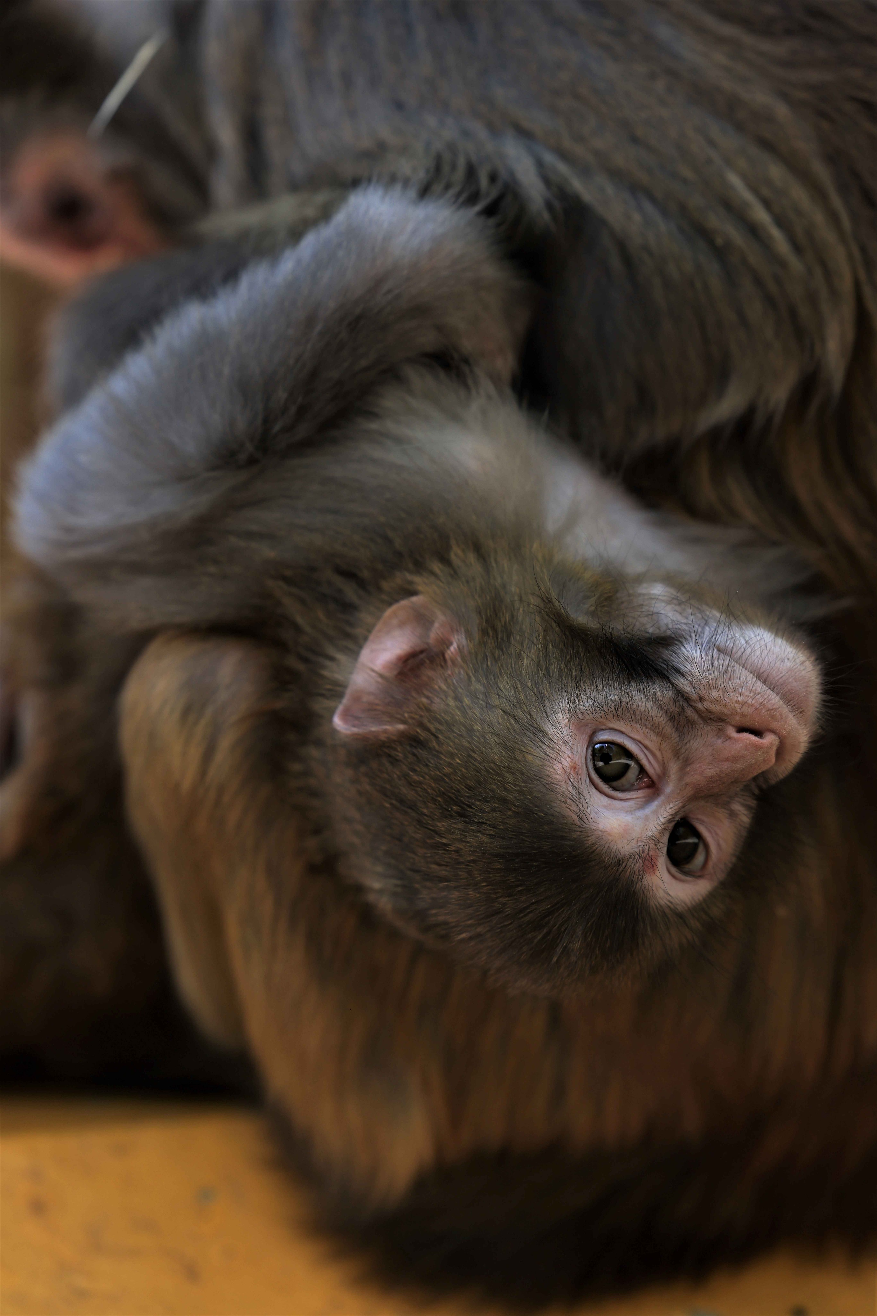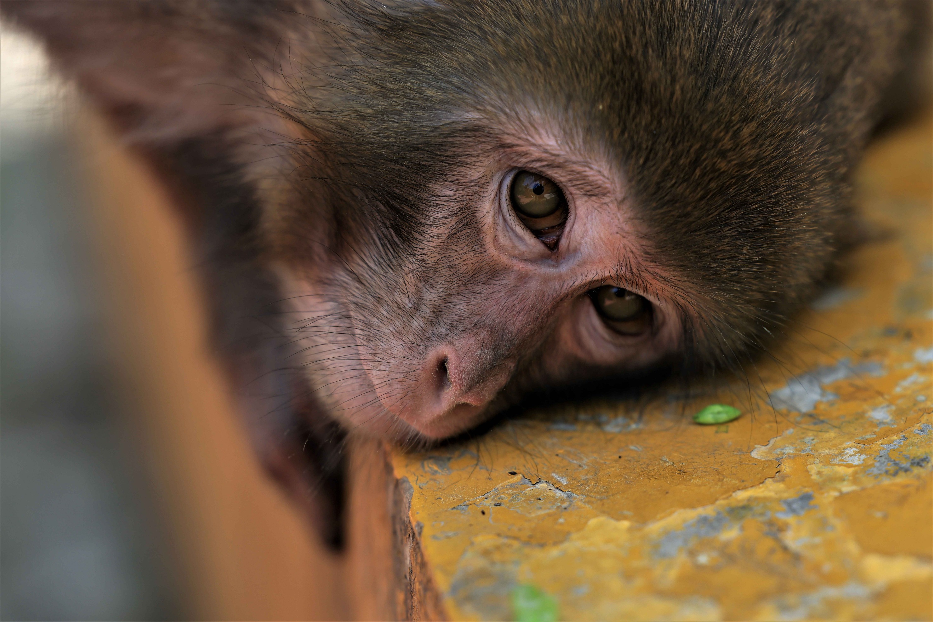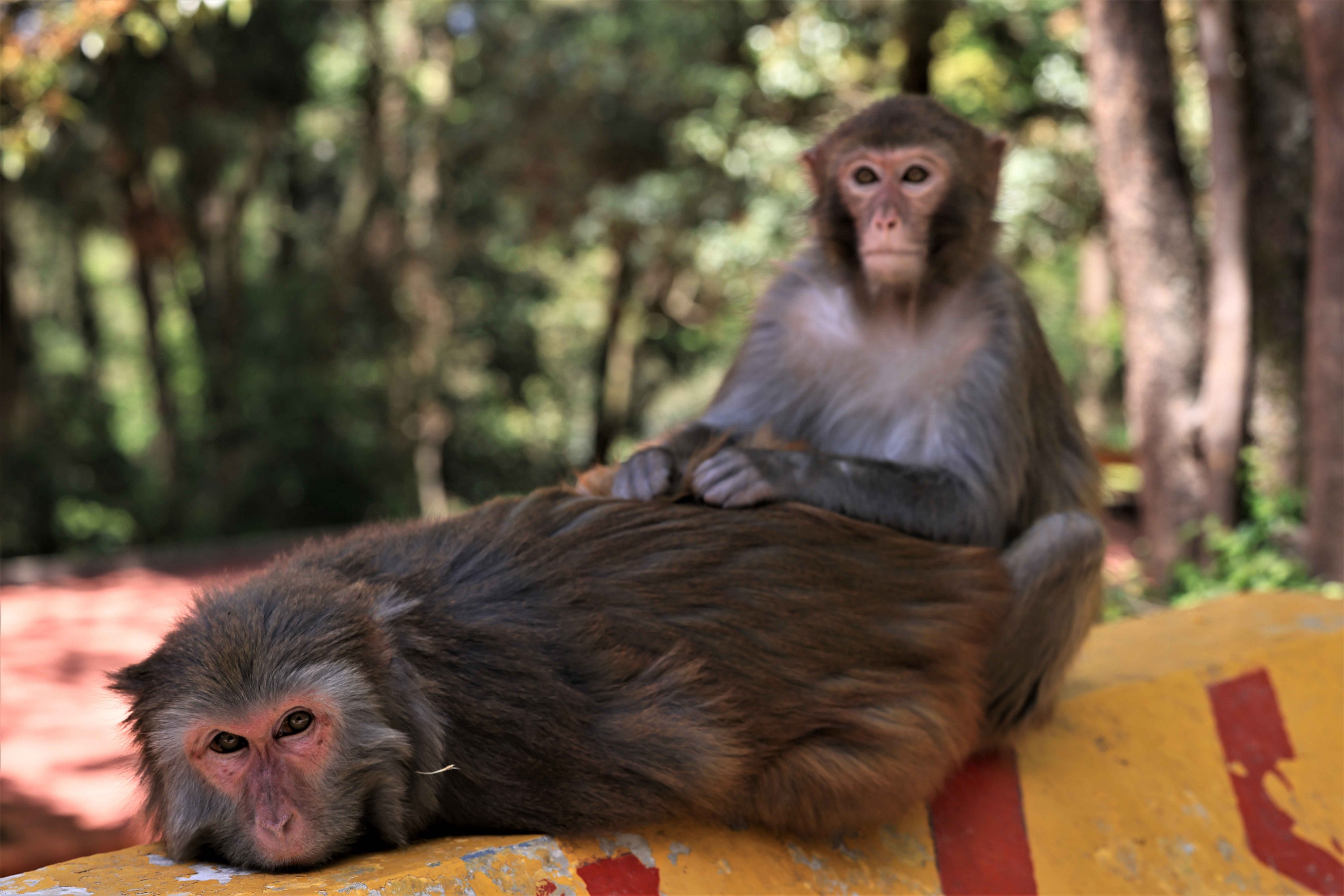 在贵阳森林公园路墩上休憩的猕猴一家,猴爸爸慵懒的趴在了石墩上,猴妈妈则贤惠的在后面帮助梳理着皮毛