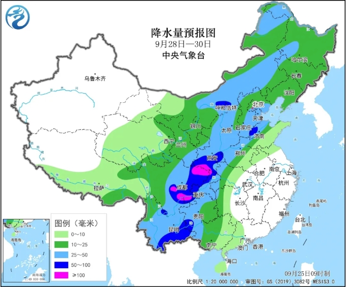 降水预报:28日至30日,西北地区东部、华北、东北、黄淮西部、西南地区等地有中到大雨,甘肃东南部、陕西南部、内蒙古中部、四川中东部、重庆西部和北部、云南东南部及山东西部等地部分地区有暴雨(累计降水量50~70毫米),陕西南部、四川东北部和南部局地大暴雨(降水量100~200毫米)。西北地区等地高海拔山区局地有降雪或雨夹雪天气。