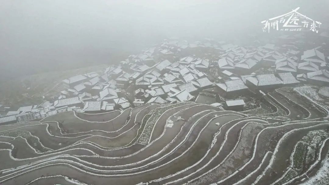 冬季来临,片片雪花从空中飘落,洋洋洒洒将梯田裹上银装。