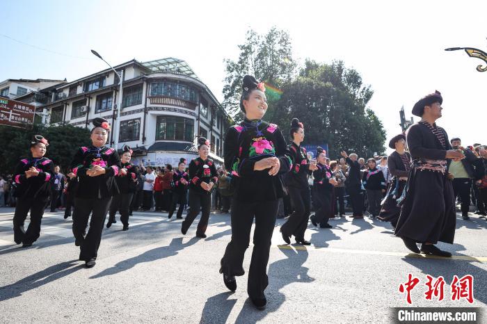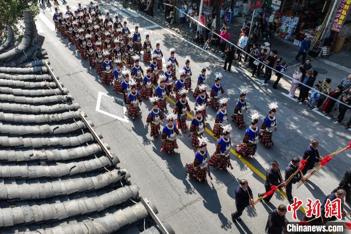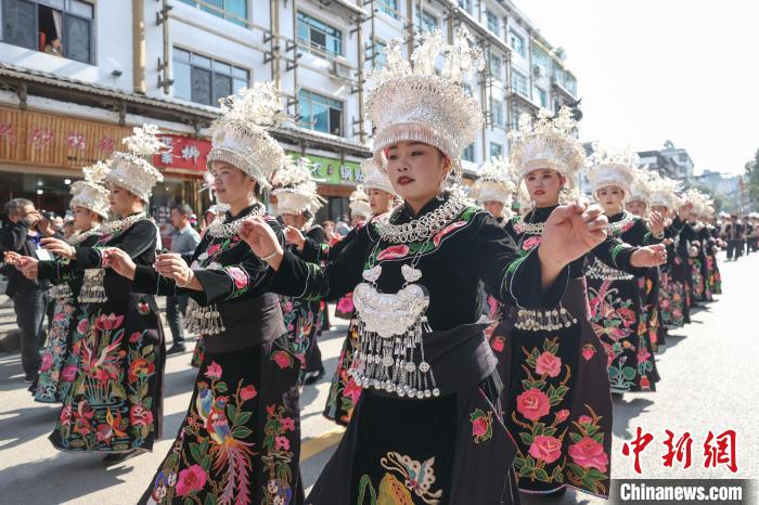 11月10日,苗族民众在巡游中跳舞。当日,2024中国·雷山苗年暨鼓藏节万人非遗巡游在贵州省黔东南苗族侗族自治州雷山县举行。中新社记者 瞿宏伦 摄