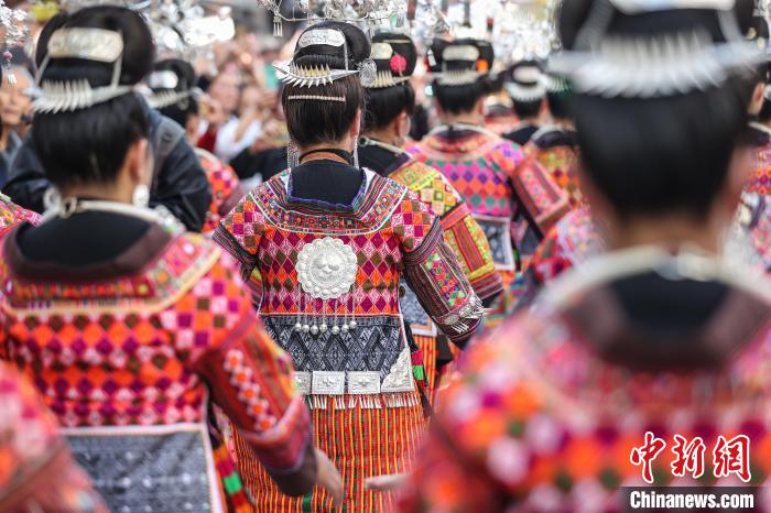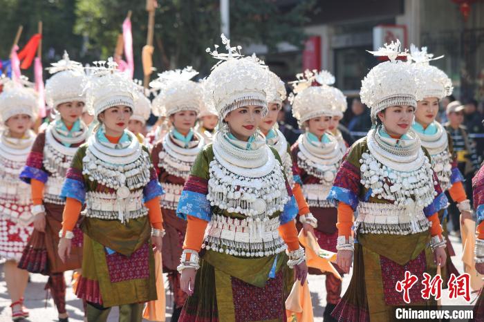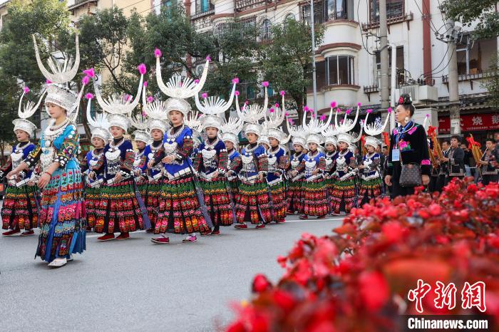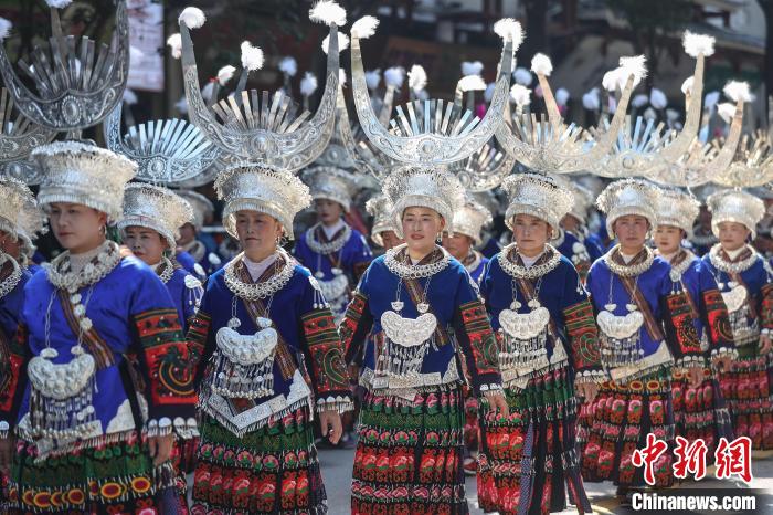 11月10日,苗族民众穿着节日盛装参加巡游。当日,2024中国·雷山苗年暨鼓藏节万人非遗巡游在贵州省黔东南苗族侗族自治州雷山县举行。中新社记者 瞿宏伦 摄