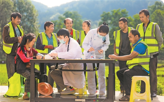 5月20日,贵州省黔西市雨朵镇工会组织当地卫生院医务人员,来到辖区内老君关社区,为环卫工人提供免费诊疗、体检、健康咨询、用药指导等服务。
