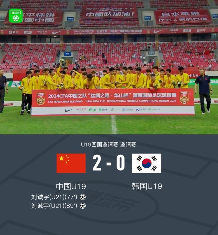 独闯龙潭小角度破门锁定胜局。最终比分中国U19 2-0 韩国U19夺得渭南四国赛冠军。