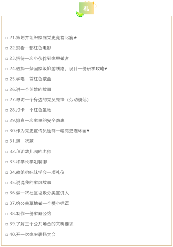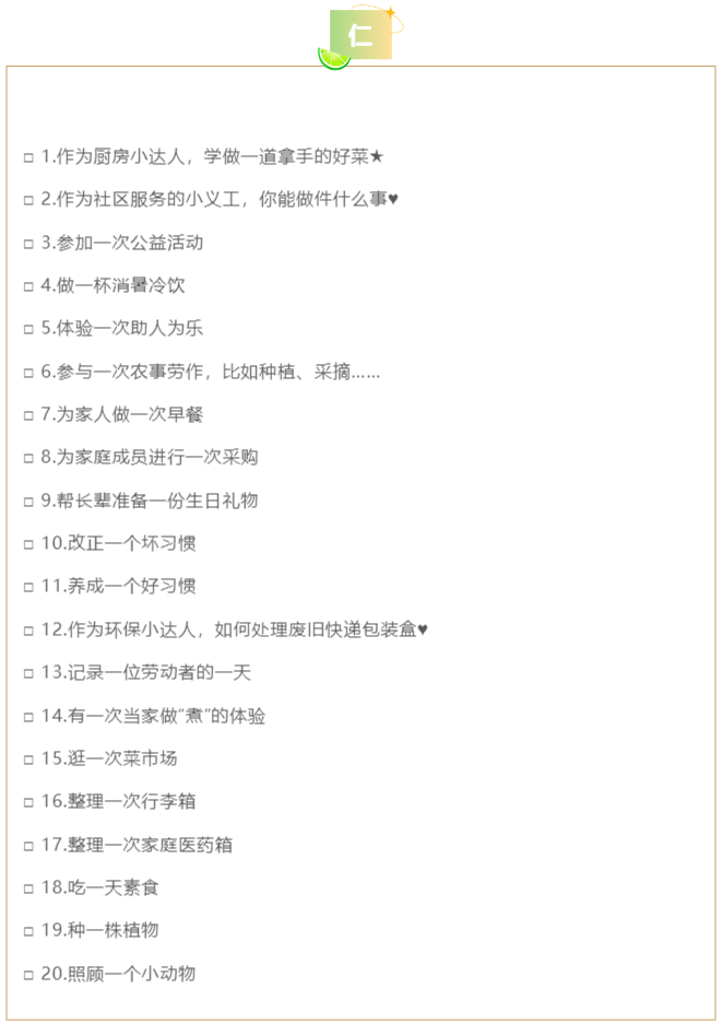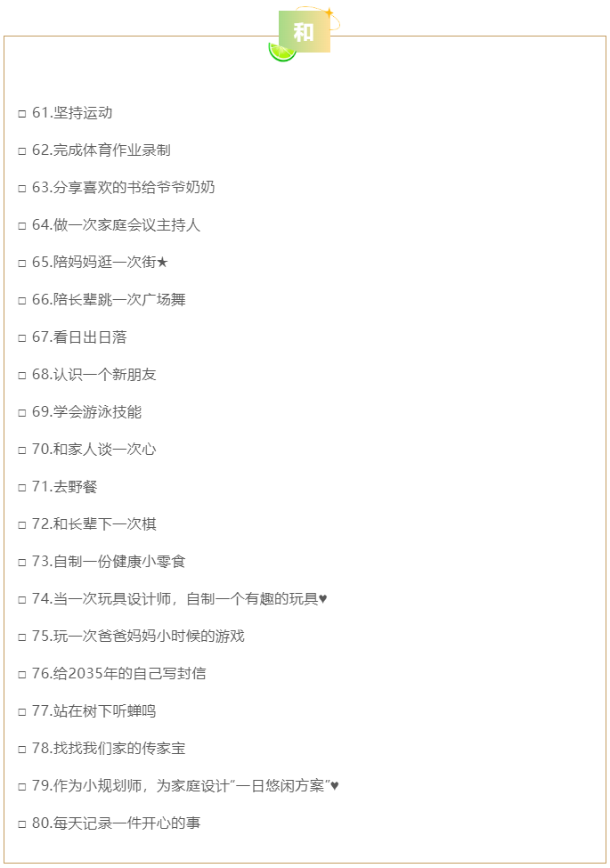 说明:"★标志"为必选清单,"♥标志"为项目学习清单,其他为自选清单。必选清单是必做的;项目学习清单需要孩子和小伙伴一起,任选1-2项,在家长帮助下完成;自选清单孩子可分别从"仁、礼、智、和、艺"五个领域选择自己感兴趣的1-2项去体验。