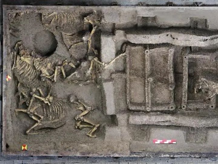 徐阳墓地考古发掘现场负责人马占山介绍,今年2月,M15陪葬车马坑的清理工作启动,这座车马坑由“马”区和“车”区两部分组成,马匹集中摆放在坑的北侧,马车集中摆放在坑的南侧。在“马”的身后,三驾呈南北竖向排列的马车已经显现,车辆轮廓清晰完整,最前面的马车体型较大,后面两辆马车体型相对较小。