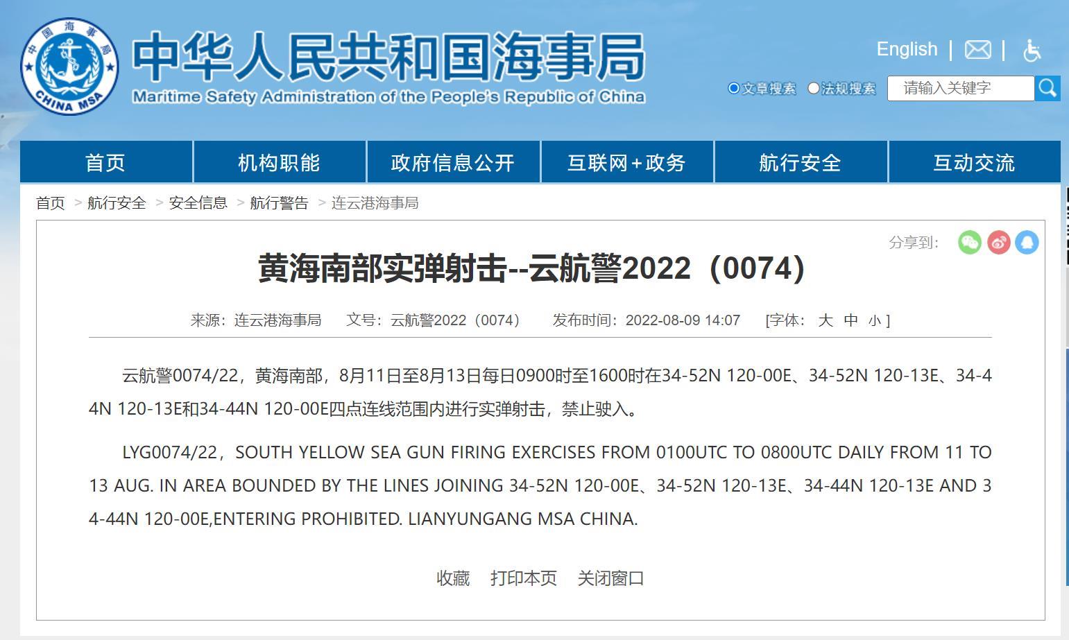 9日,连云港海事局发布黄海南部海域航行警告。黄海南部,8月11日至8月13日每日0900时至1600时在34-52N 120-00E、34-52N 120-13E、34-44N 120-13E和34-44N 120-00E四点连线范围内进行实弹射击,禁止驶入。