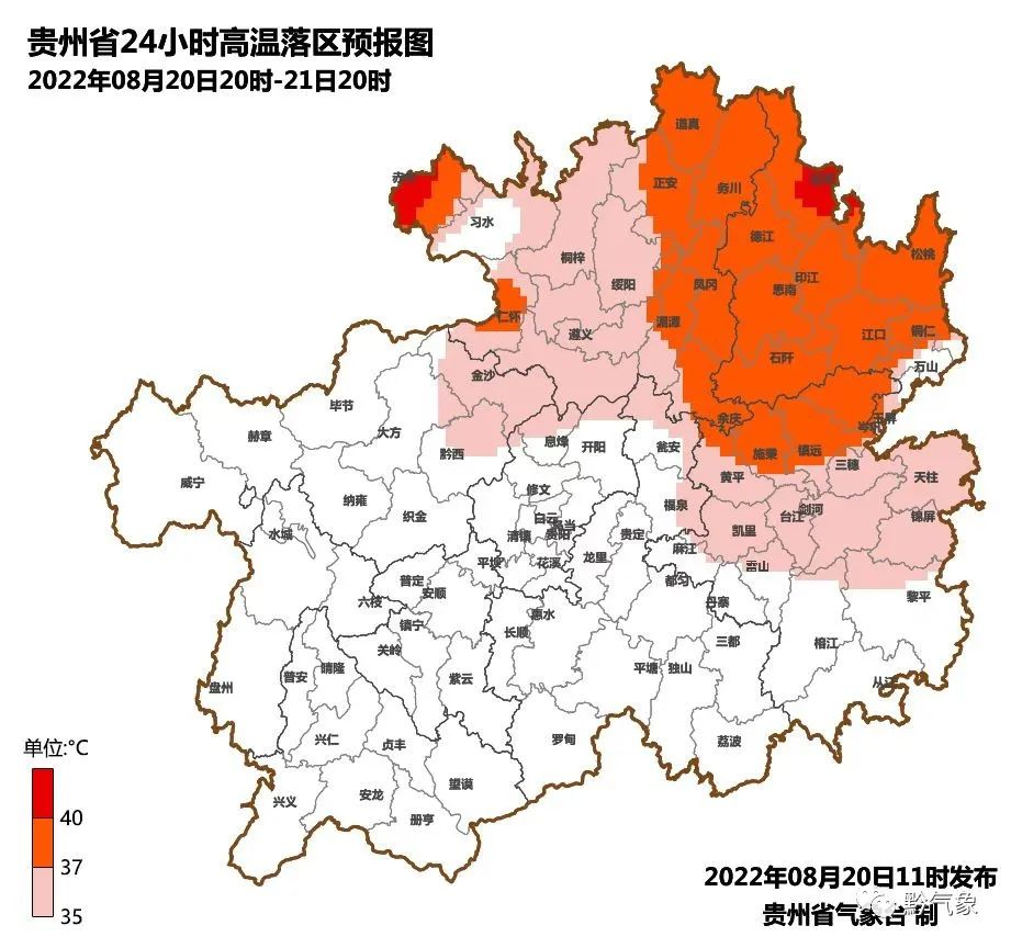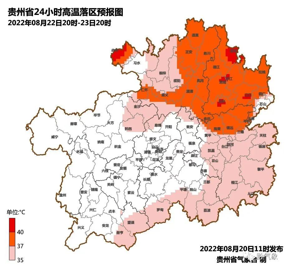 有49县出现高温:赤水为最高43.2℃,赤水、江口、沿河高于40℃,松桃、石阡、德江、道真、印江、仁怀、思南、碧江、余庆、岑巩、施秉、玉屏、镇远、剑河、正安、汇川、凤冈、三都、罗甸、湄潭、桐梓21县在35至39.9℃之间,息烽、务川、绥阳、黔西、锦屏、榕江、习水、凯里、天柱、台江、从江、播州、三穗、望谟、乌当、荔波、金沙、册亨、平塘、黄平、惠水、福泉、雷山、黎平、都匀等25县在25至36.9℃之间。