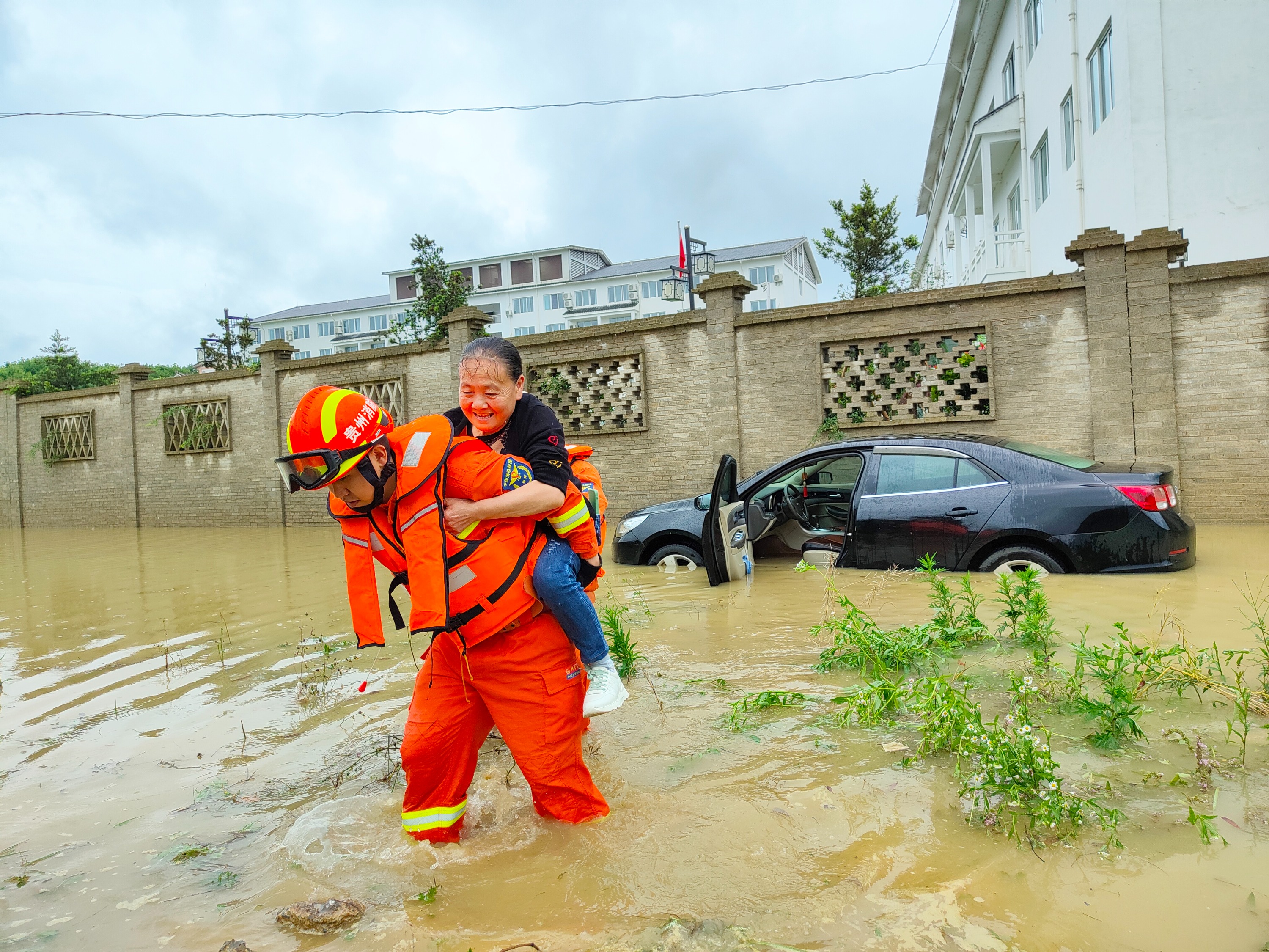 近日,贵州多地遭遇暴雨袭击,导致城市内涝,群众被困,各地消防紧急出动,营救被困群众。