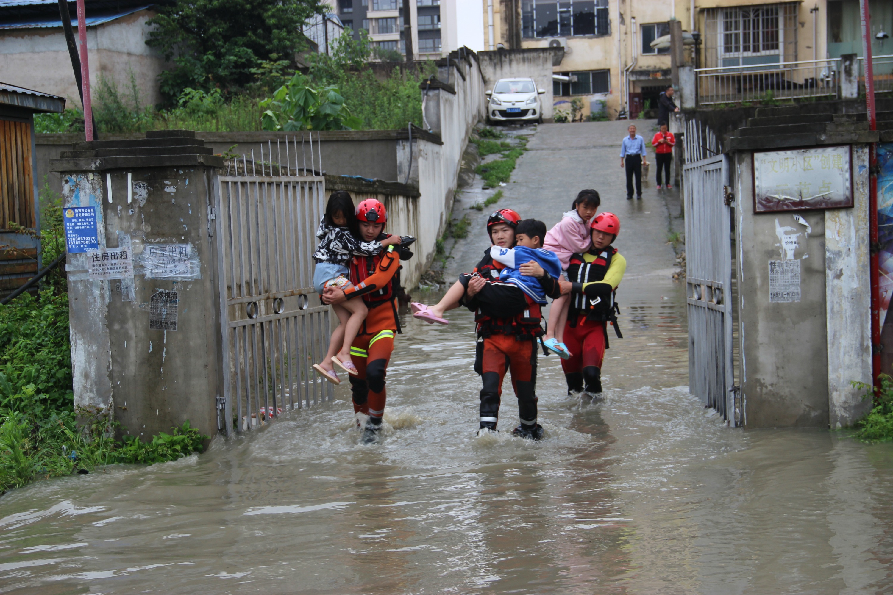 近日,贵州多地遭遇暴雨袭击,导致城市内涝,群众被困,各地消防紧急出动,营救被困群众。