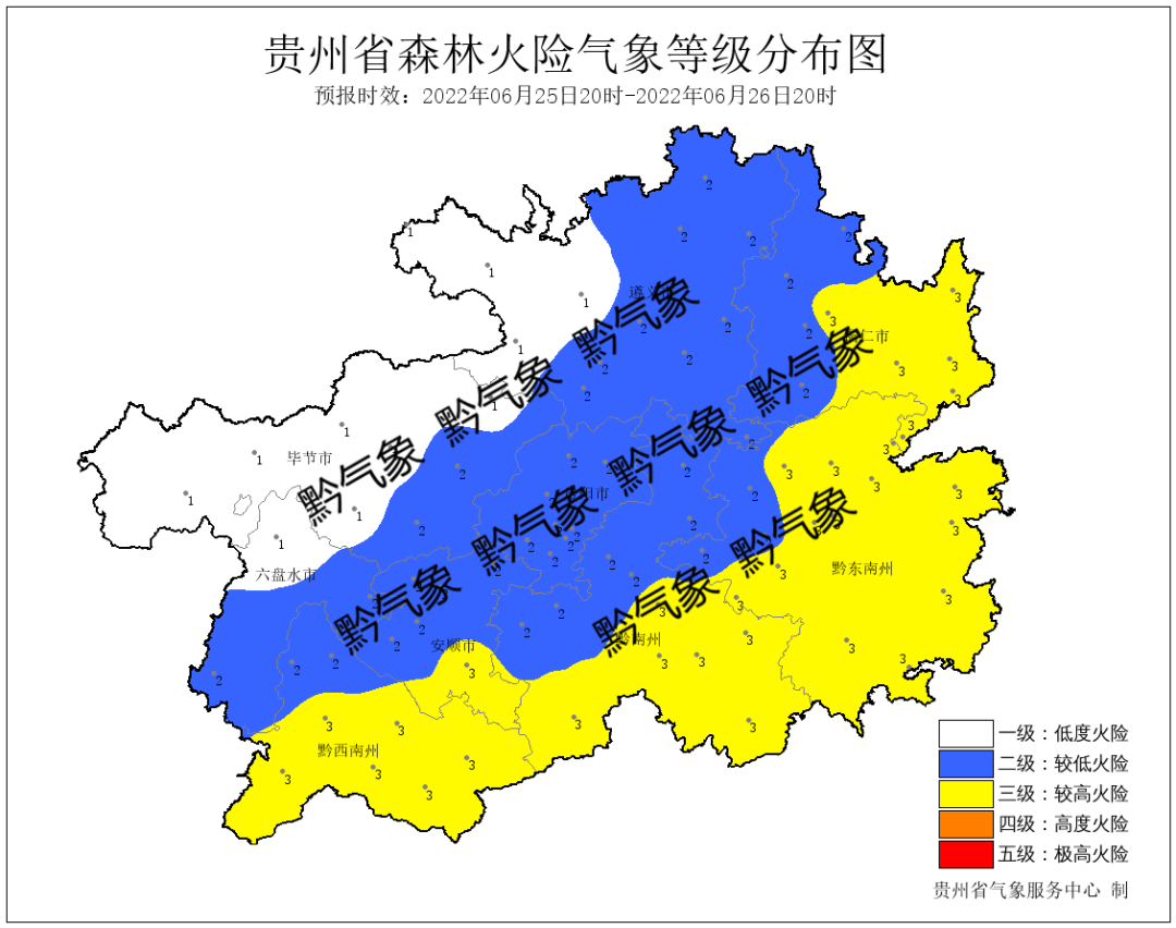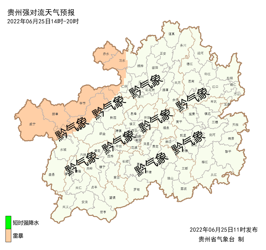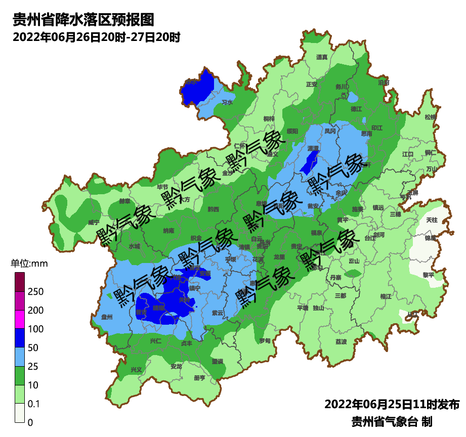 6月24日08时至6月25日08时,省的西北部和北部边缘地区阴天间多云有阵雨或雷雨,暴雨出现在七星关区、赫章县2县域内的4个观测站(最大为七星关水箐88.4毫米),大雨有27个观测站,其余地区多云间阴天有分散阵雨或雷雨。