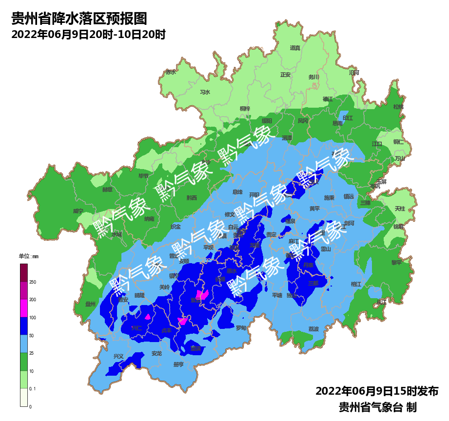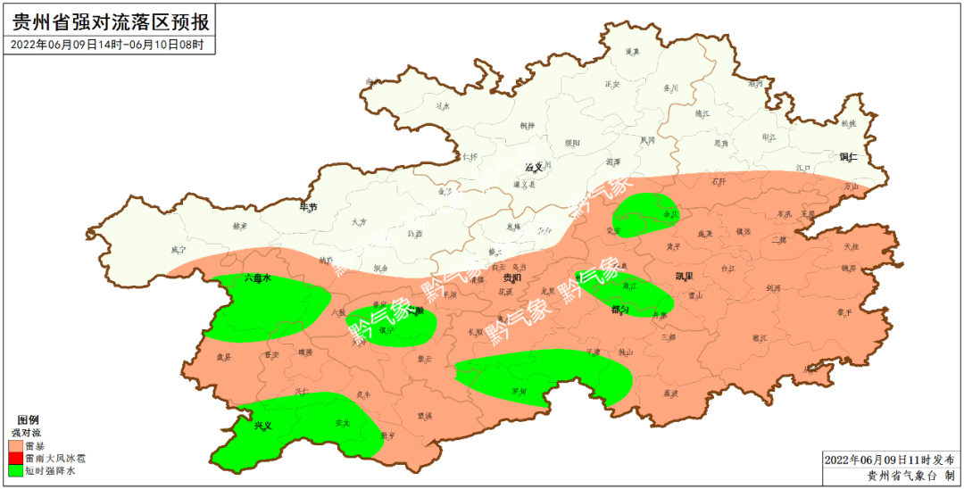 今天傍晚到明天白天,全省各地阴天有阵雨或雷雨,雨量普遍中雨,毕节市南部、六盘水市东部和南部、黔西南州、安顺市、贵阳市、遵义市南部、黔南州、铜仁市西南部、黔东南州中西部有大雨到暴雨,部分乡镇有大暴雨;