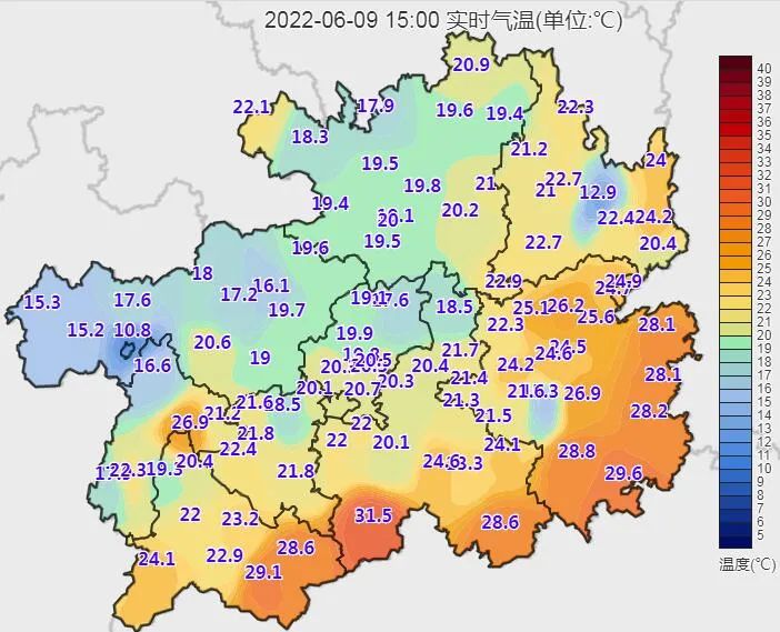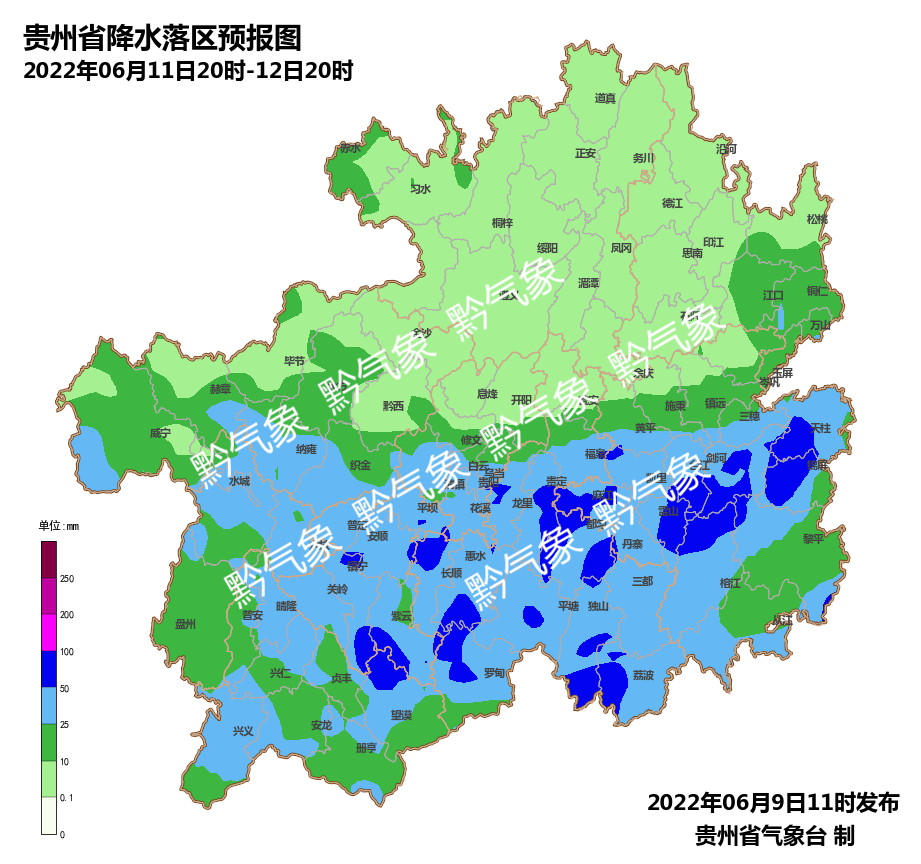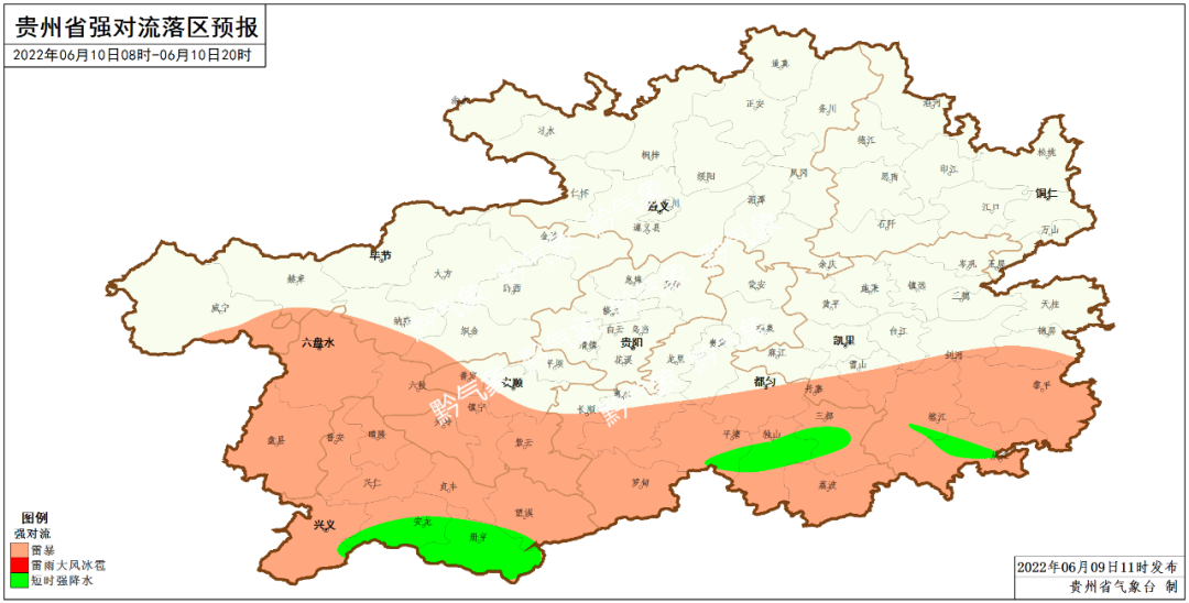 10夜间到11日白天,省的南部地区阴天有阵雨或雷雨,雨量中雨,六盘水市南部、黔西南州、安顺市南部、黔南州南部、黔东南州东南部有大雨到暴雨,其余地区阴天间短时多云有分散阵雨或雷雨。