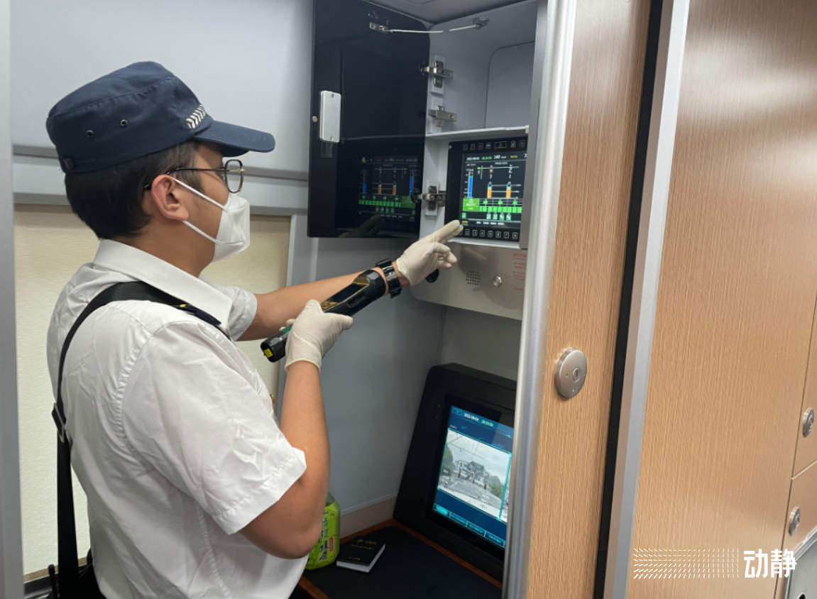 “体温36.1°,健康码为绿色,24小时核酸结果为阴性,无异常,可以进行出乘准备。”9月3日5时,身着蓝色制服,穿戴护目镜、口罩,全副武装的随车机械师龙梦凡走进乘务派班室办理出乘手续,手续执行完毕后,龙梦凡又仔细对手电筒、对讲机、巡视腰带等随身携带工具进行全面消毒。