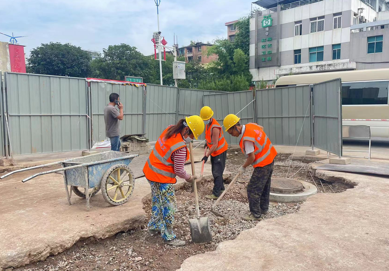 在贵阳市经开区西江巷“背街小巷改造工程”施工现场,工人师傅们正在进行排污排水管道的施工。施工繁忙有序,道路两旁的住户们纷纷投来关切的目光。