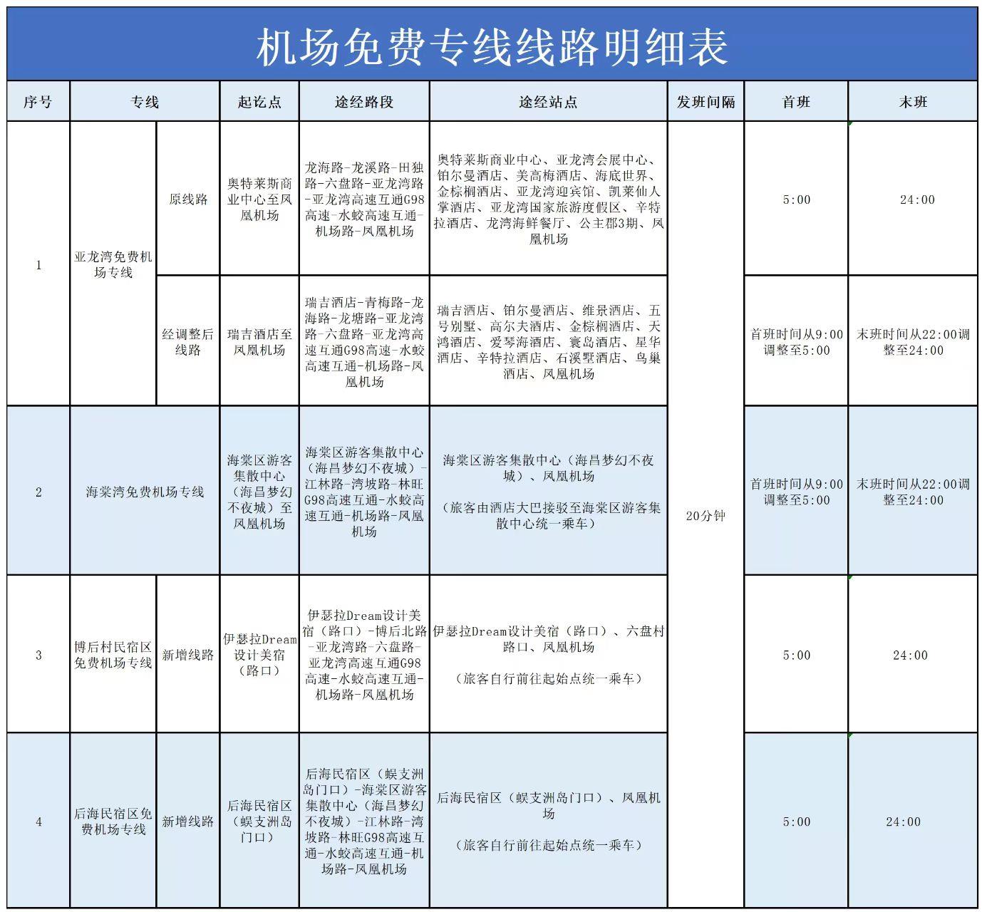 二、根据实际运行情况,调整亚龙湾临时机场专线,具体调整线路见附表,原专线首班时间均从9:00调整至5:00,末班时间从22:00调整至24:00。