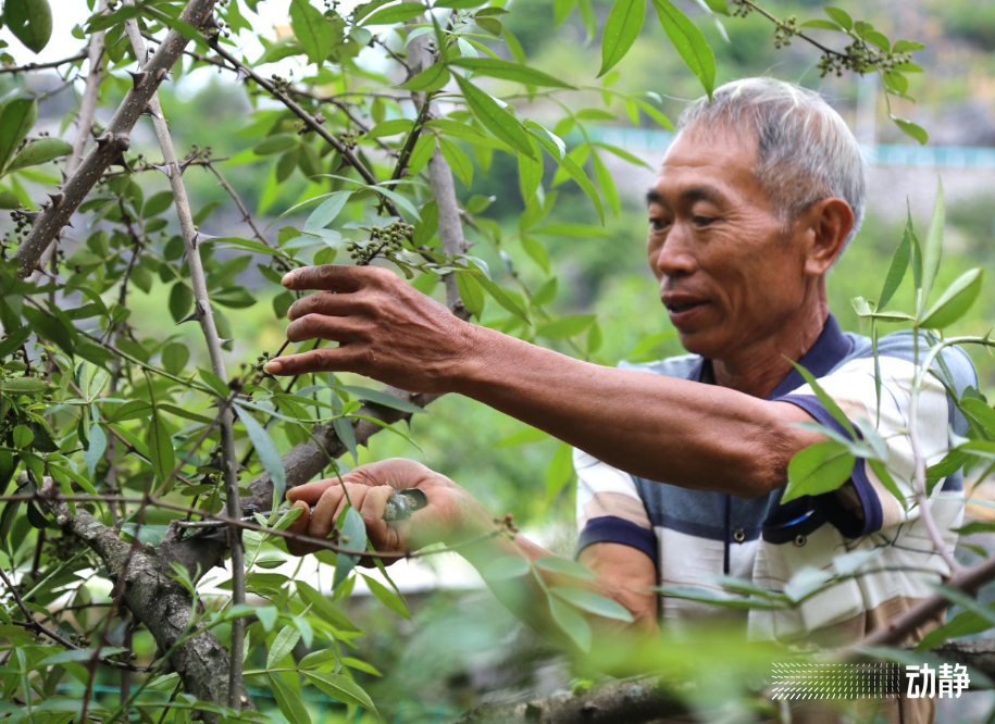 村民胡明忠正忙着给自家的花椒树剪枝,今年他家的6000多株花椒树可为他带来约五万元的收入。