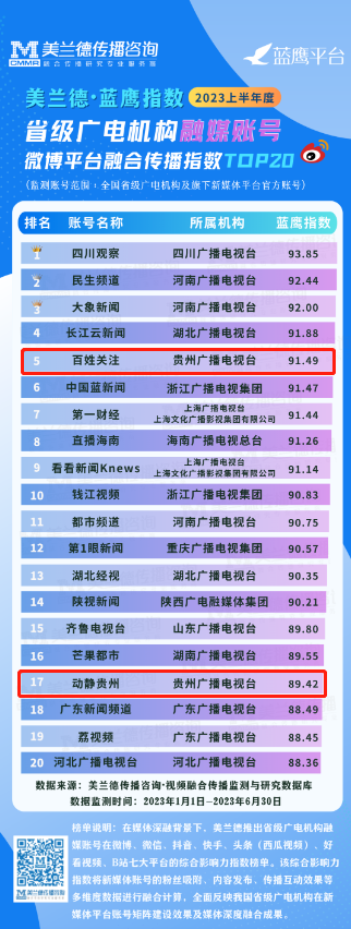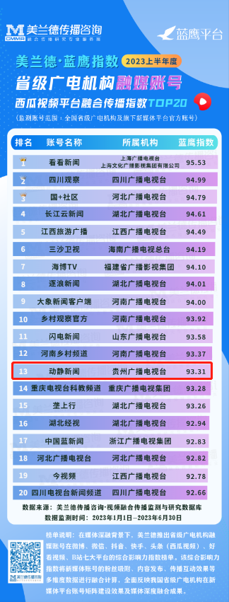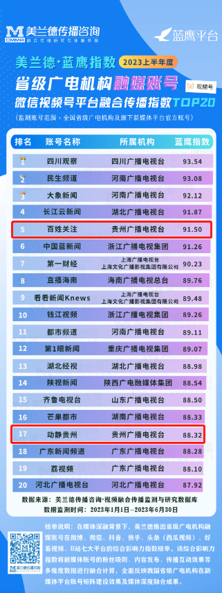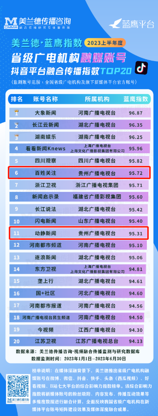 7月18日,美兰德2023上半年省级广电融媒账号榜单发布,贵州广播电视台“动静”“百姓关注”两个新媒体矩阵账号分别在“微博平台融合传播指数”“抖音平台融合传播指数”“快手平台融合传播指数”“西瓜视频平台融合传播指数”“Bilibili平台融合指数”“微信视频号平台融合传播指数”“好看视频平台融合传播指数”等排行进入TOP20榜单。