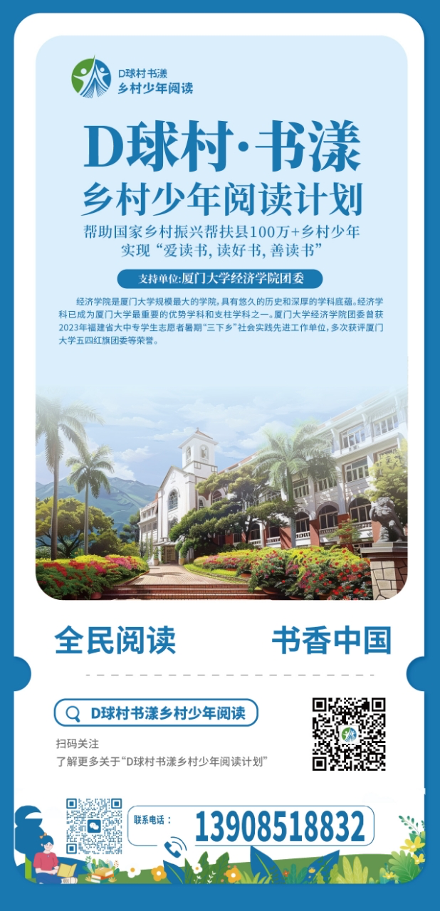 由贵州广播电视台、地球村三农集团、书漾读书会联合发起“D球村·书漾乡村少年阅读计划”,一直得到很多热心单位和团体的支持。近日,贵州省对外文化交流协会、清华大学学生唐仲英爱心社、厦门大学经济学院团委也加入支持单位行列,使支持计划的单位和团体达到13家。