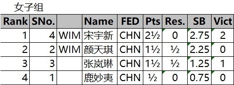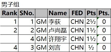 当日进行了第一循环赛。男子组,李荻首轮和许翔宇打平,后两轮分别战胜卢尚磊、刘言,暂时领先;女子组,宋宇新在前两轮战胜鹿妙夷、张岚琳,第3轮奕和颜天琪,暂居榜首。