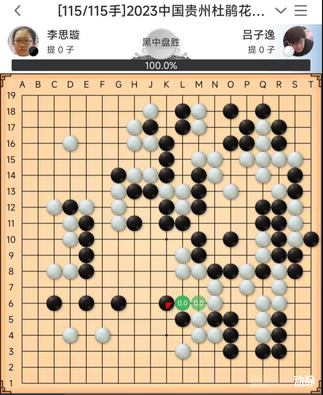 今日,在2023年“中国•贵州•杜鹃花季”第27届全国围棋邀请赛的最后一轮比赛中,此前8战全胜的夺冠热门棋手李思璇二段执黑对战吕子逸业余5段,通过中盘的猛烈攻击鲸吞白棋大龙,一举拿下比赛!就此李思璇二段在此次比赛中9战全胜,霸气夺冠!