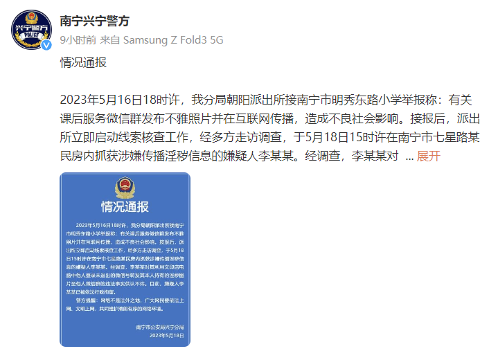 2023年5月16日18时许,我分局朝阳派出所接南宁市明秀东路小学举报称:有关课后服务微信群发布不雅照片并在互联网传播,造成不良社会影响。接报后,派出所立即启动线索核查工作,经多方走访调查,于5月18日15时许在南宁市七星路某民房内抓获涉嫌传播淫秽信息的嫌疑人李某某。经调查,李某某对其利用文印店电脑中他人登录未退出的微信号转发其本人持有的淫秽图片至他人微信群的违法事实供认不讳。 目前,嫌疑人李某某已被依法行政拘留。