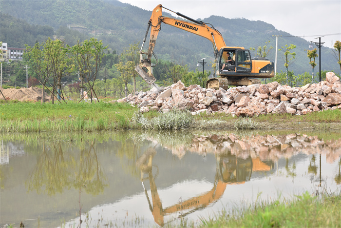 在龙山镇余下村农旅项目施工现场,记者看到一片繁忙景象,数台挖掘机穿梭在施工现场,进行场平工作和碎石作业。