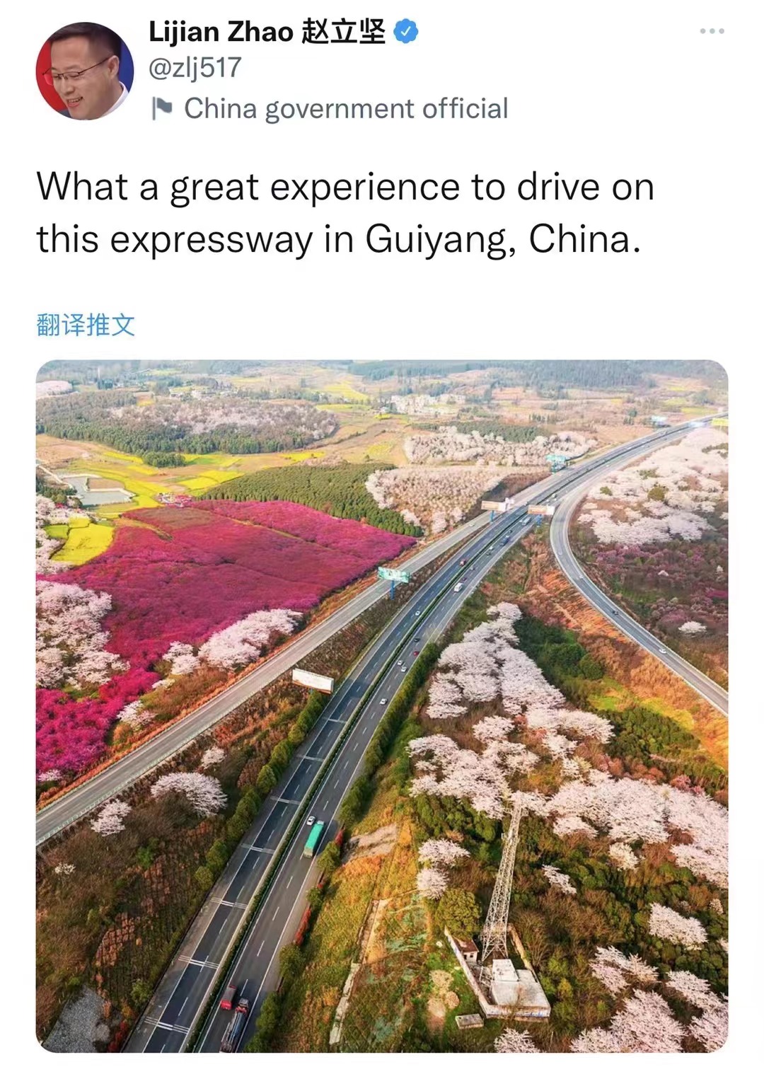 今天(4月22日),赵立坚又在推特平台上发布了一张美图,并配文“What a great experience to drive on this expressway in Guiyang,China.(在中国贵阳的这条高速公路上开车,是一种多么棒的体验。)”,向全世界宣传推介贵州,点赞这条“樱花公路”。