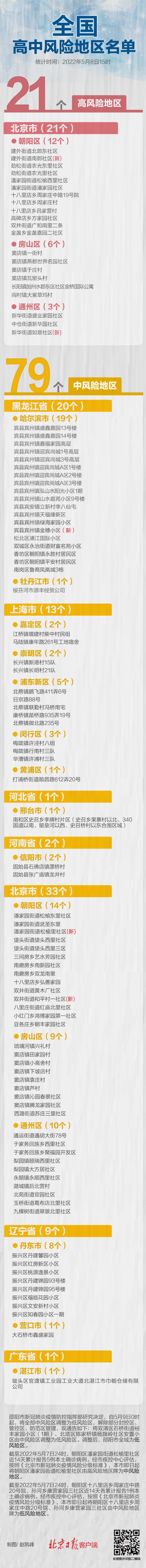 5月8日,北京宣布即日起将朝阳区建外街道南郎社区、通州区新华街道如意社区升级为高风险地区。